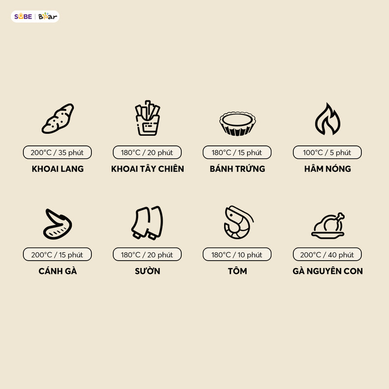 - Tháo rời tiện lợi: Các bộ phận tiếp xúc trực tiếp với thực phẩm có thể tháo rời hoàn toàn khỏi thân máy, thuận tiện cho việc cọ rửa. 10 Chức năng của nồi chiên không dầu Bear 6L AF-5H20J75 Nồi chiên không dầu Bear 6L AF-5H20J75 được trang bị nhiều chức năng tiện lợi, giúp bạn chế biến đa dạng các món ăn. Dưới đây là bảng tổng hợp 10 chức năng chính: Tên chức năng Công dụng Thời gian tham khảo (phút) Nhiệt độ tham khảo (°C) Khoai lang Nướng/làm chín khoai lang nguyên củ hoặc cắt miếng. 35 200 Khoai tây chiên Chiên khoai tây cắt sợi hoặc cắt miếng, tạo độ giòn vàng. 20 180 Bánh trứng Nướng các loại bánh trứng (egg tart) hoặc các loại bánh nhỏ tương tự. 15 180 Hâm nóng Làm nóng lại thức ăn đã nấu chín, giữ được độ ẩm và hương vị. 5 100 Cánh gà Chiên/nướng cánh gà, đùi gà, tạo lớp da giòn và thịt bên trong chín mềm. 15 200 Sườn Nướng sườn cốt lết, sườn miếng, giúp sườn chín đều và có màu đẹp. 20 180 Tôm Chiên/nướng tôm, giúp tôm chín tới, giữ được vị ngọt tự nhiên. 10 180 Gà Nướng gà miếng lớn hoặc gà nguyên con (kích thước phù hợp với nồi). 40 200 Hẹn giờ Cài đặt thời gian bắt đầu nấu tự động sau một khoảng thời gian nhất định. / Tùy chỉnh Nêm nếm Điều chỉnh độ mềm (biểu tượng “Mềm”) hoặc độ giòn/vàng (biểu tượng “Giòn”) cho món ăn, tùy theo khẩu vị Tùy chỉnh người dùng (điều chỉnh từ chế độ gốc) Tùy chỉnh người dùng (điều chỉnh từ chế độ gốc) Bảng này giúp bạn dễ dàng lựa chọn chế độ và thông số phù hợp cho từng món ăn.