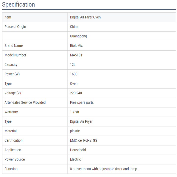 Nồi chiên không dầu điện tử dung tích lớn 12 Lít Biolomix MA510T 1600W - HÀNG NHẬP KHẨU