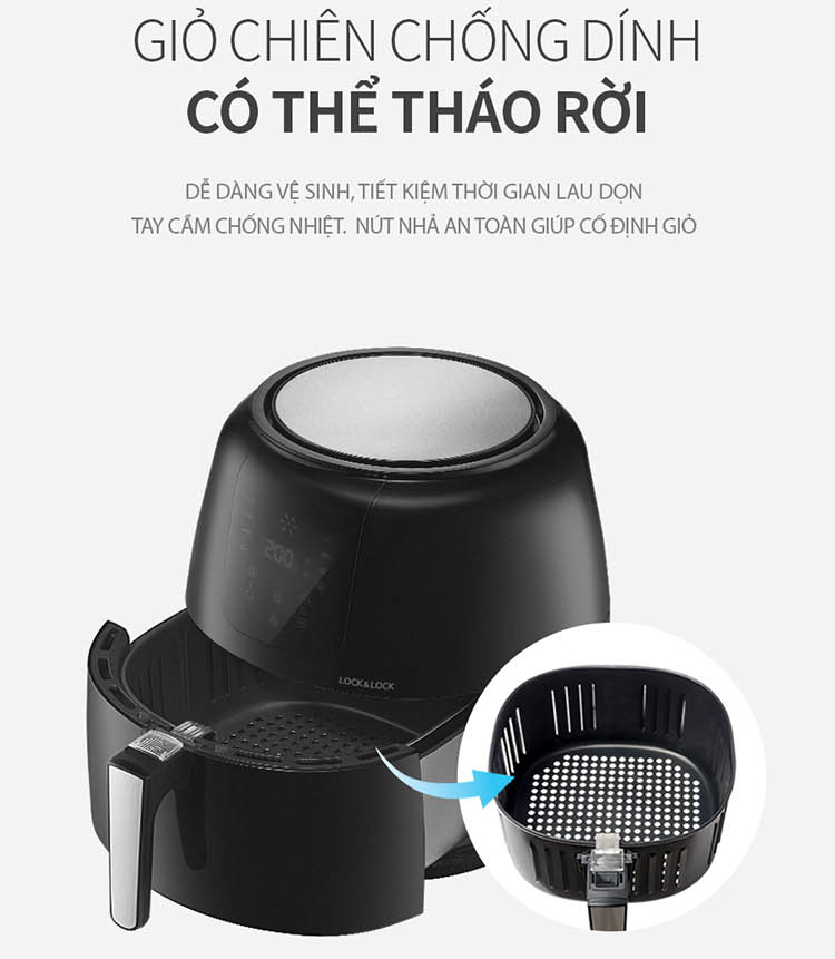 Dung tích nồi chiên Lock&lock EJF296BLK phù hợp để bạn chiên thực phẩm ăn trong ngày cho gia đình khoảng 6-8 người. Với dung tích này, bạn có thể chế biến các món như: Cánh gà chiên, đùi gà chiên, khoai tây/ khoai lang chiên,… hoặc chiên nguyên cả con gà.