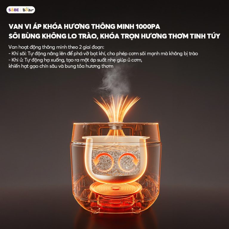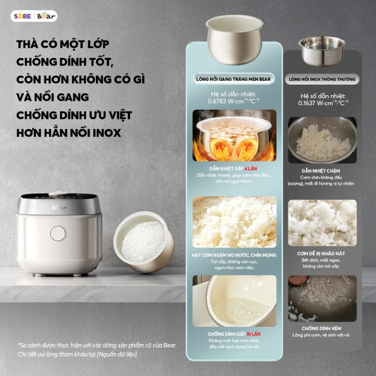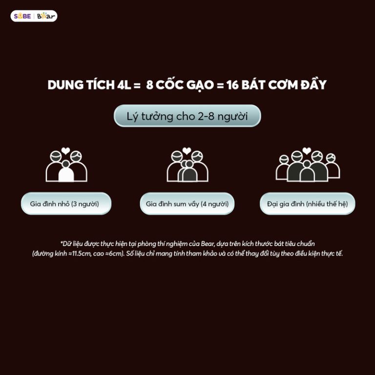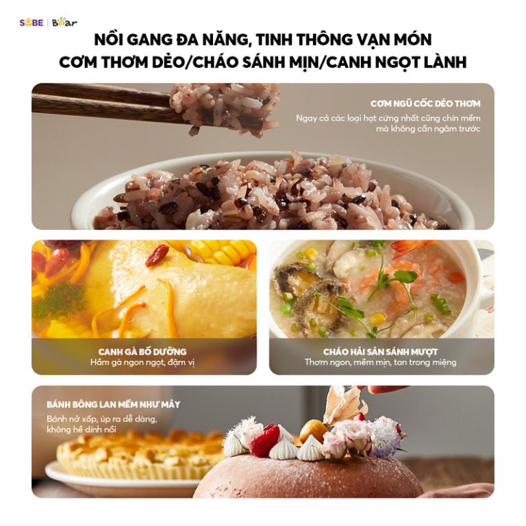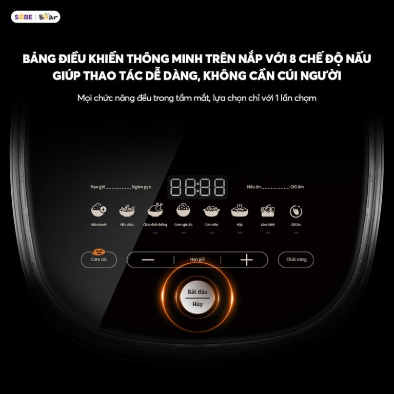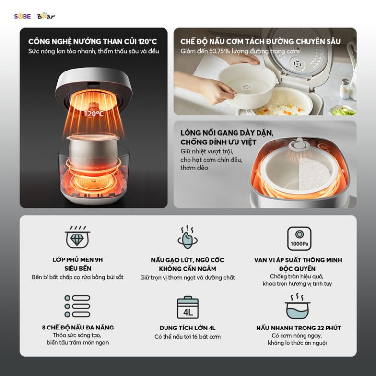 8 chế độ nấu tiện lợi. Nồi cơm được trang bị màn hình cảm ứng thông minh với 8 chế độ nấu, giúp bạn dễ dàng lựa chọn chương trình phù hợp chỉ bằng một chạm, không cần cúi người thao tác. Các chế độ đa dạng như nấu nhanh 22 phút, nấu cơm dẻo thơm, hầm súp 2 giờ, hấp bánh, giữ ấm… đáp ứng mọi nhu cầu nấu ăn. Hệ thống điều chỉnh thời gian và nhiệt độ thông minh giúp cơm chín đều, giữ trọn vị ngon. Với thiết kế tối ưu, Bear 4L không chỉ giúp nấu cơm ngon mà còn hỗ trợ chế biến nhiều món ăn khác, mang đến trải nghiệm nấu nướng tiện lợi, hiện đại, phù hợp với mọi gia đình.