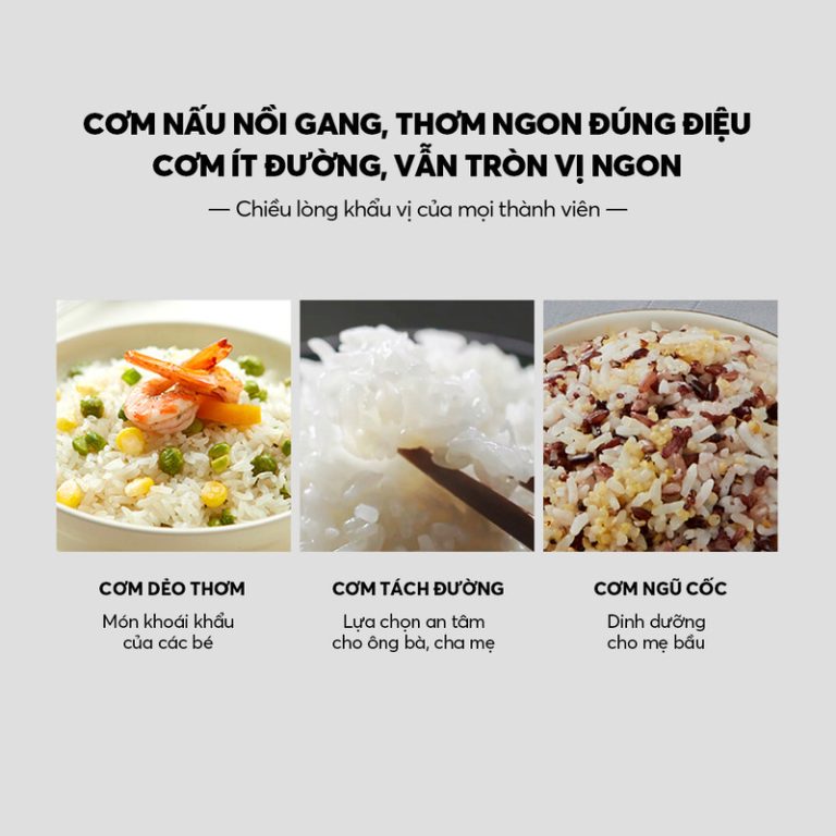 MENU ĐA NĂNG: • Chức năng nấu dinh dưỡng: Qunioa, Steel Cut Oatmeal, Brown, GABA Brown, Steam • Chức năng nấu cơm theo từng loại gạo: Long & Short Grain White, Premium, Congee(Thick & Thin),