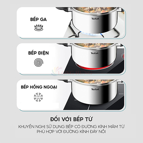 - Hiệu suất nấu nướng vượt trội Đáy nồi 3 lớp: Gồm lớp inox bên ngoài, lớp nhôm ở giữa và lớp inox từ tính bên trong, giúp truyền nhiệt nhanh và đều. Tương thích với mọi loại bếp: Bao gồm bếp từ, bếp gas, bếp điện và bếp hồng ngoại.