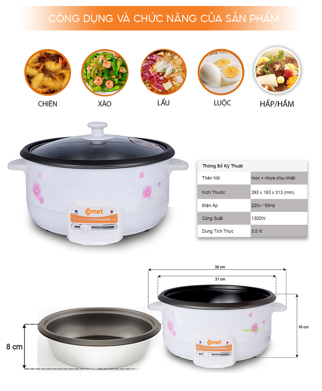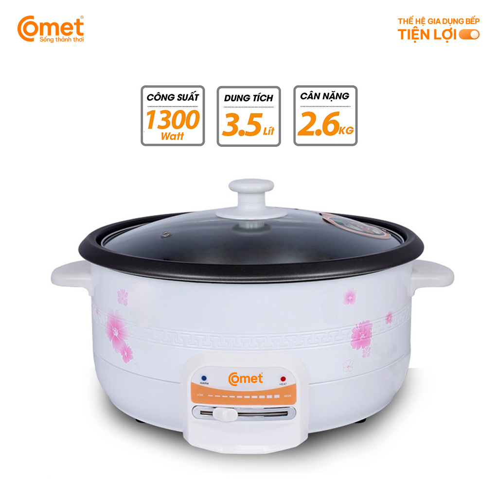 THÔNG SỐ KỸ THUẬT - Thương hiệu: Comet - Mã sản phẩm: CM7731 - Công suất: 1300W - Điện áp: 220V/50Hz - Dung tích: 3.5 lít - Lòng Nồi: Phủ men chống dính - Nắp