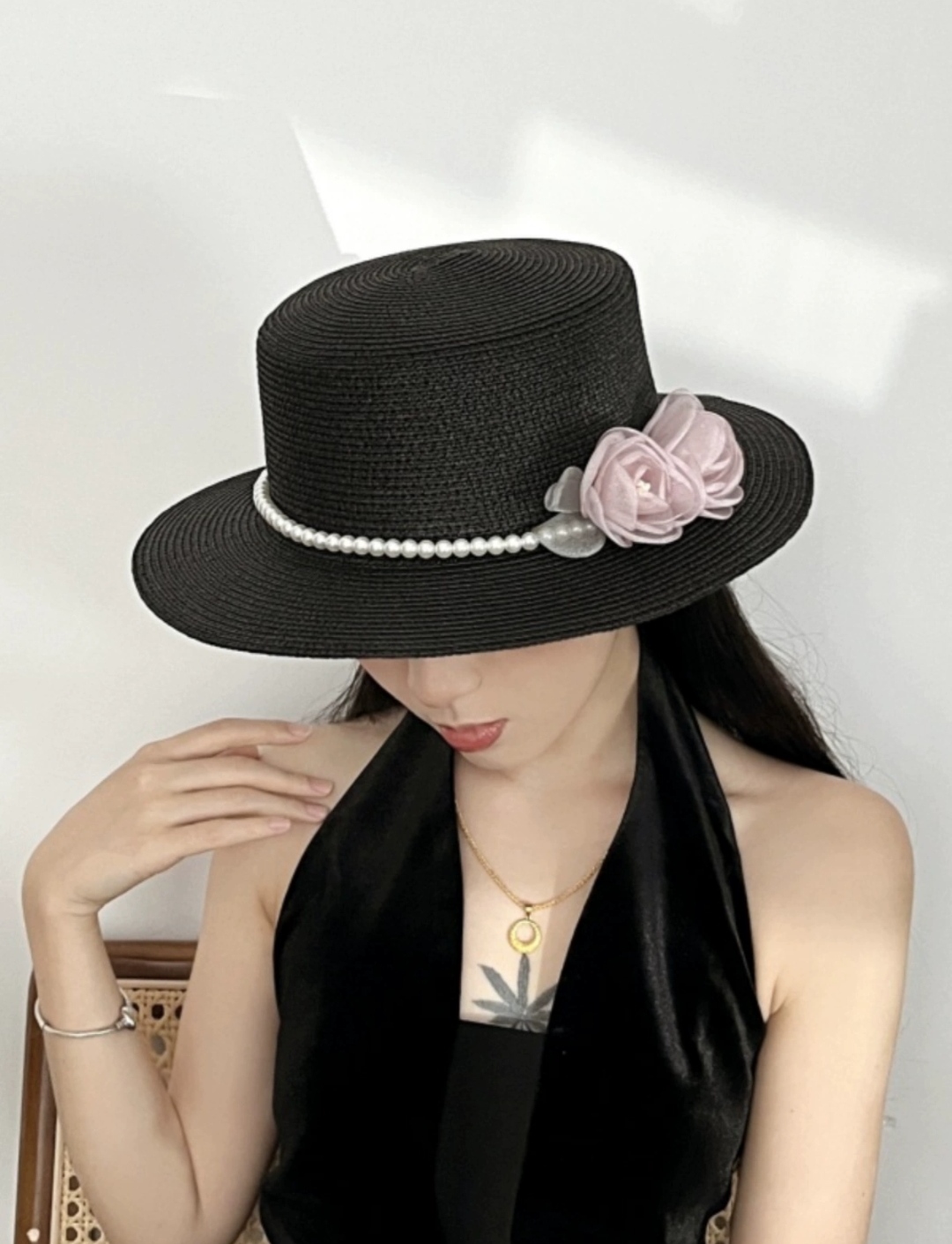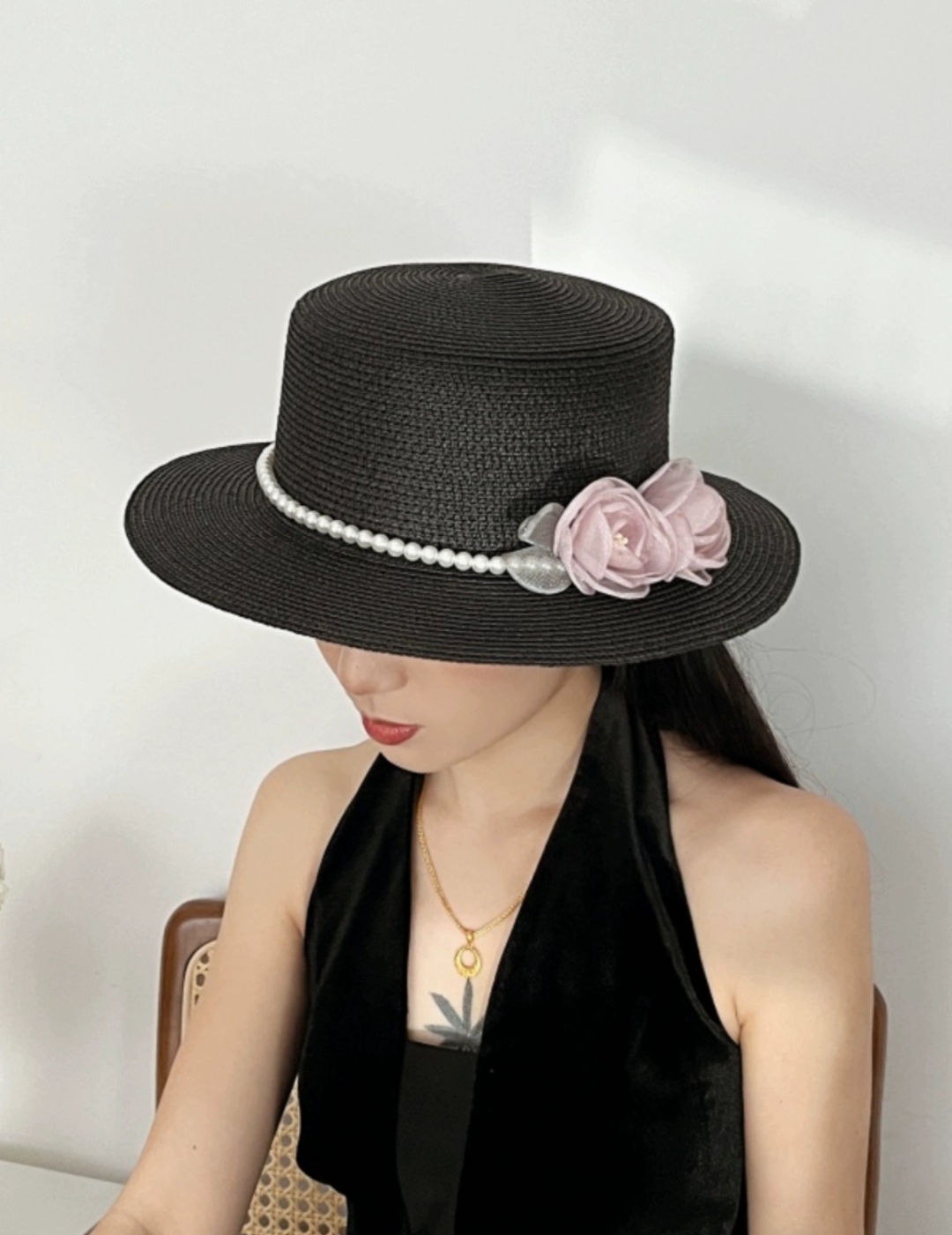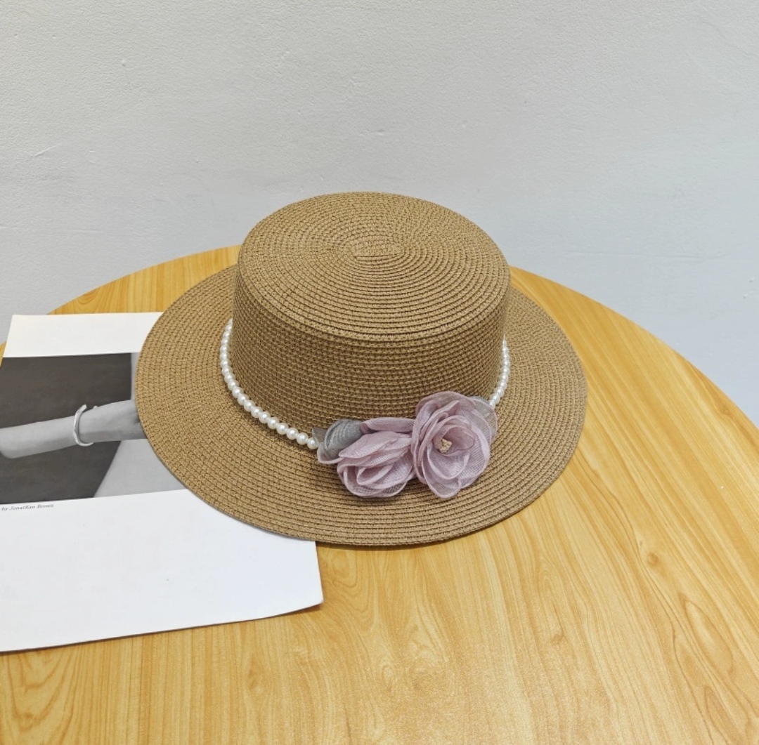 ✨Nón mũ rộng vành nhỏ chất liệu cói mũ rộng vành đi biển phối đai ngọc trai nhân tạo gắn 2 hoa màu hồng xinh mẫu mới thời trang Hàn Quốc dona24082508