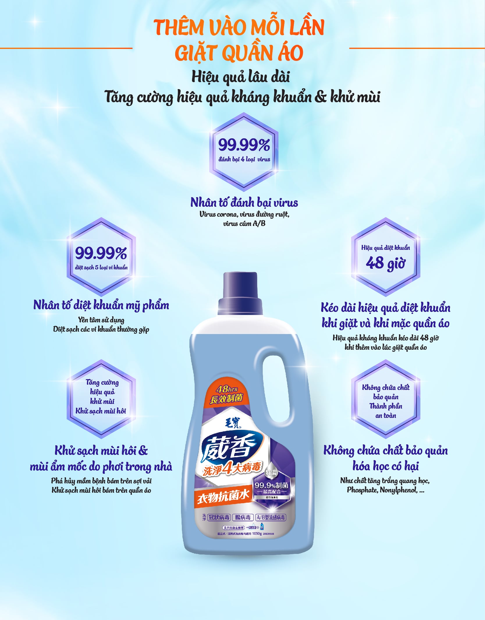 - Hiệu quả kháng khuẩn & khử mùi kéo dài 48 giờ