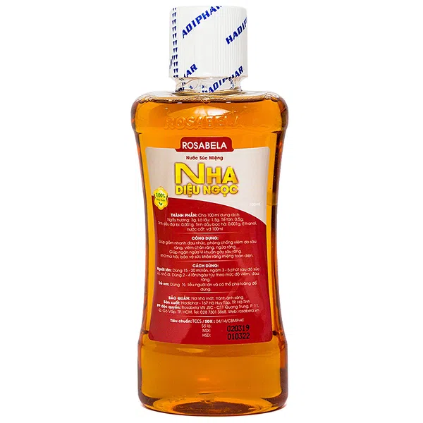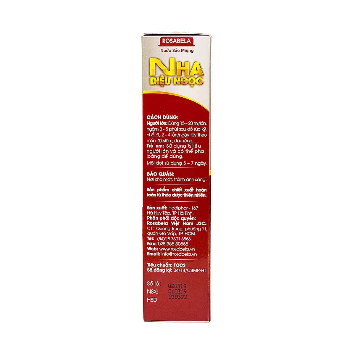 - Nước Súc Miệng Rosabela Nha Diệu Ngọc (200ml) chiết xuất hoàn toàn từ thảo dược hỗ trợ giảm đau, giảm viêm, khử mùi hôi, ngăn ngừa các bệnh viêm nhiễm về răng miệng, giúp phòng ngừa và ngăn chặn các bệnh răng miệng hiệu quả, an toàn.