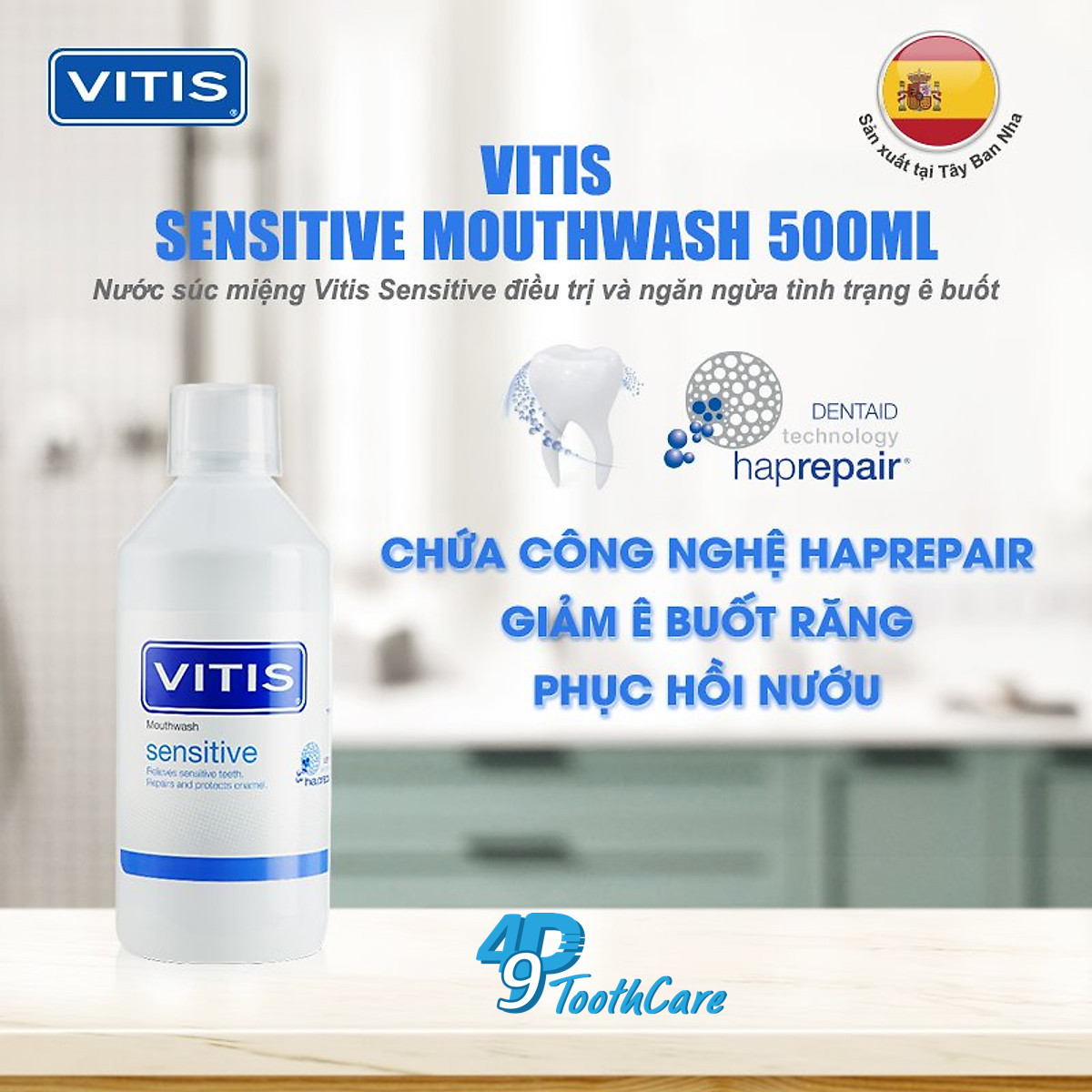 Nước súc miệng ngăn ngừa răng ê buốt Vitis Sensitive Mouthwash chứa công nghệ tái tạo nano Dentaid tạo thành một lớp bảo vệ giúp phục hồi, tái tạo bề mặt men răng một cách