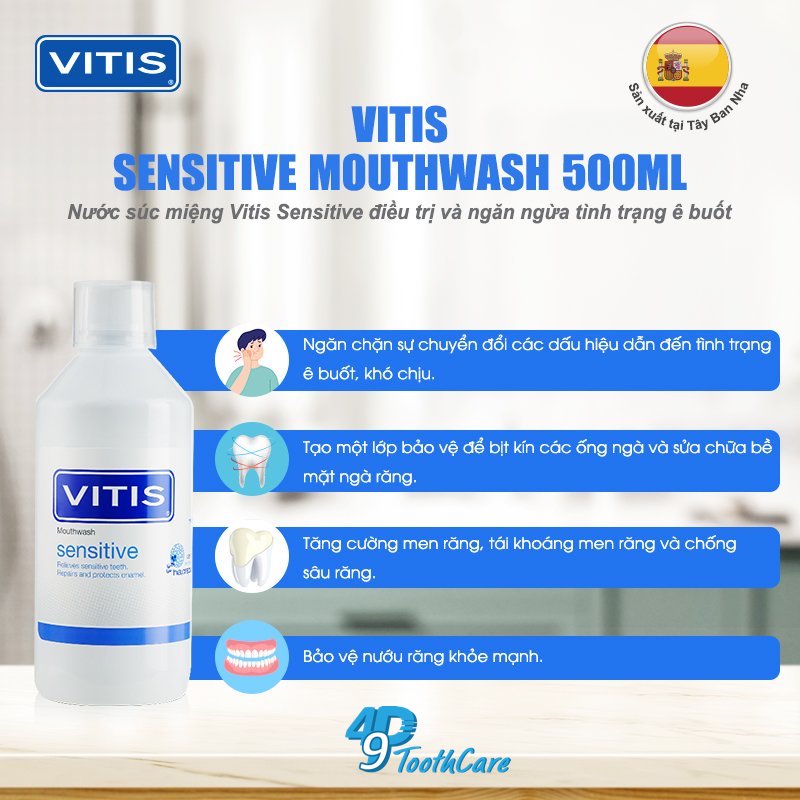 - Nước súc miệng Vitis Sensitive là sản phẩm sử dụng hằng ngày có công thức đặc biệt để cải thiện và xoa dịu tình trạng ê buốt.