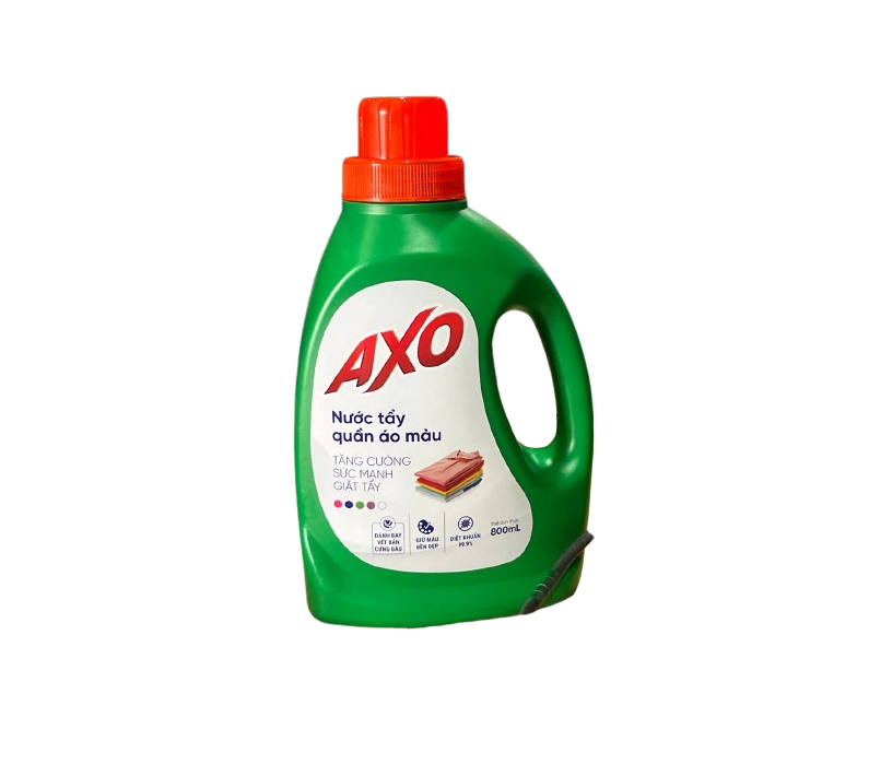Nước Tẩy Quần Áo Màu Axo Xanh Lá Hương Thông Xanh Chai 800ml có công thức chuyên dụng cho quần áo màu, giúp tẩy sạch nhẹ nhàng các vết bẩn nhưng không làm phai màu áo quần. VỚi oxo, bạn không cần tốn công chà quá mạnh, chỉ cần vò nhẹ hoặc ngâm quần áo vào nước tẩy là đã có thể tẩy sạch những vết bẩn cứng đầu hiệu quả.