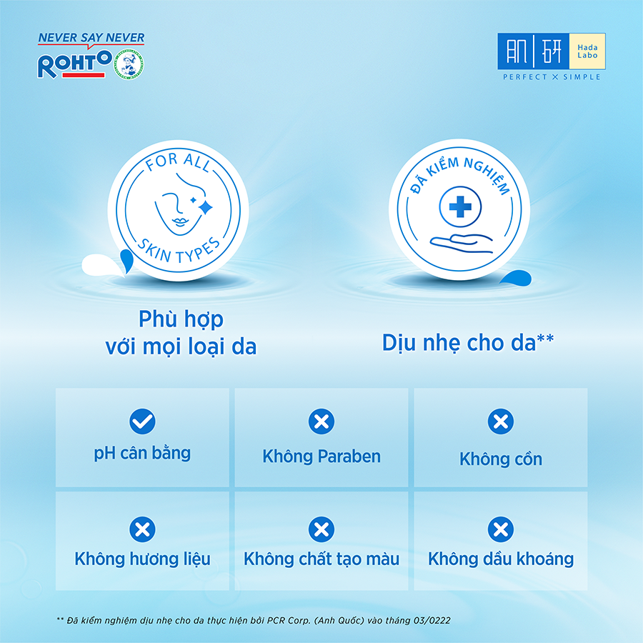 - Hệ dưỡng ẩm sâu HA (HA, Super HA, Nano HA) với tỉ lệ kết hợp hoàn hảo giúp cung cấp độ ẩm tối ưu, tăng cường độ đàn hồi, duy trì độ ẩm cho da. Nước tẩy trang sạch sâu dưỡng trắng Hada Labo vơi công thức dịu nhẹ không cồn, không hương liệu, không chất tạo màu, không dầu khoáng, không Paraben và pH cân bằng; phù hợp với mọi loại da để sử dụng hàng ngày kể cả khi không trang điểm. Hướng dẫn sử dụng nước tẩy trang sạch sâu dưỡng trắng Hada Labo: