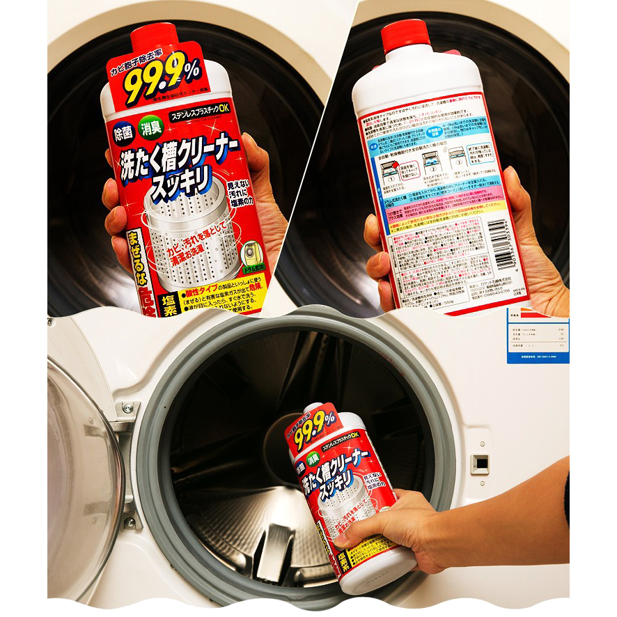 Xuất xứ: Nhật Bản Hãng sản xuất: Rocket Soap Co., Ltd Japan. Thể tích: 550g   Nước tẩy vệ sinh lồng máy giặt Rocket 99,9% Nhật Bản đang rất được ưa chuộng tại thị trường Việt Nam. Nước vệ sinh lồng máy giặt Rocket 99.9% không chỉ tốt bởi công dụng tuyệt vời của nó mà còn bởi giá thành cạnh tranh nhưng chất lượng Nhật Bản Các gia đình hiện nay có sử dụng máy giặt đều không nên thiếu nước tẩy lồng máy giặt 99,9% của Nhật này trong nhà. Rocket 99,9% không những giúp vệ sinh máy giặt nhà bạn sạch, sáng hơn, giặt đồ được trắng hơn mà nó còn giúp tăng tuổi thọ sử dụng cho chiếc máy giặt cực kỳ hiệu quả. Hàng nội địa Nhật Bản, sản xuất bởi Rocket Soap Co., Ltd Japan. Sử dụng cho các loại máy giặt: lồng đứng, lồng ngang và lồng nghiêng.   Công dụng nước tẩy lồng máy giặt Rocket 99.9% ✓ Nước tẩy vệ sinh lồng máy giặt Rocket Nhật Bản loại bỏ đến 99.9% bào tử nấm mốc. ✓ Nước tẩy rửa có chứa Clo sẽ nhanh chóng tiếp cận các vết bẩn và loại bỏ nấm mốc ở sâu trong lồng giặt. ✓ Lồng giặt sẽ luôn giữ được mùi hương dễ chịu và trạng thái tiệt trùng. ✓ Giúp máy giặt quần áo được trắng sạch, diệt khuẩn hiệu quả. ✓ Góp phần tăng độ bền của máy giặt. ✓ Dùng được cho máy giặt các loại cửa như, cửa trên, cửa trước…   Thành phần nước tẩy vệ sinh lồng máy giặt Rocket 99,9% Nhật Bản 550g Thành phần: Natri hypochlorite, NaOH (1.0%), chất hoạt động bề mặt (alkylamine oxide).   Hướng dẫn sử dụng nước tẩy rửa vệ sinh lồng máy giặt của Nhật Bản Rocket 99,9% Với máy giặt dưới 6kg: dùng 1/2 chai / 1 lần. Với máy giặt trên 6kg: dùng 1 chai / 1 lần.   – Đối với máy giặt cửa trên: