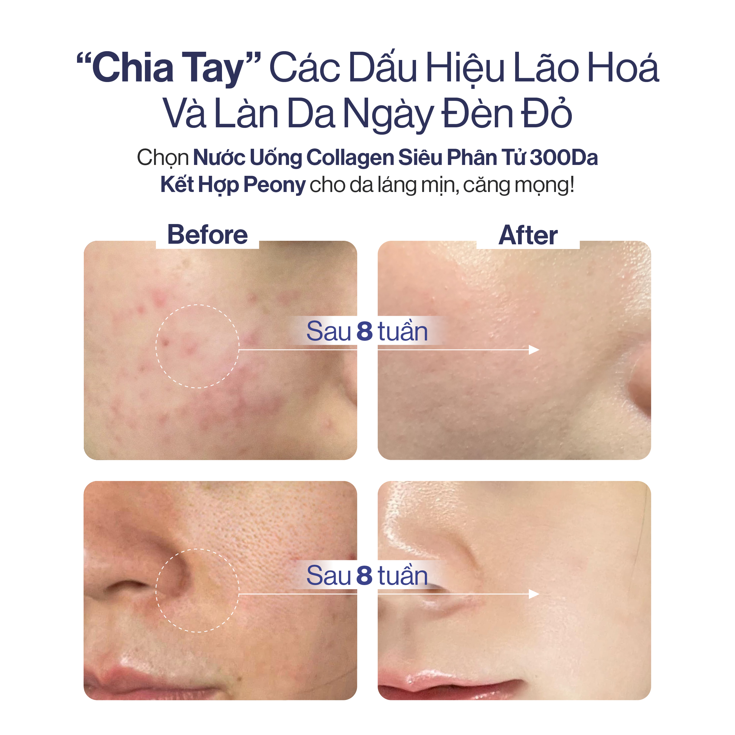 THÔNG TIN SẢN PHẨM Công dụng Cải thiện các dấu hiệu của tuổi tác, củng cố cấu trúc làn da, giảm nếp nhăn và tình trạng chảy xệ Cân bằng nội tiết, hỗ trợ giảm mụn và phục hồi làn da căng mịn Lưu ý: Sản phẩm này không phải là thuốc và không có tác dụng thay thế thuốc chữa bệnh Thành phần 5000mg Collagen Siêu Phân Tử: có khối lượng siêu nhỏ dưới 300Da, tăng khả năng hấp thụ vào cơ thể gấp 200 lần và đẩy nhanh hiệu quả trẻ hóa da Peony: Cân bằng nội tiết, hỗ trợ giảm mụn và phục hồi làn da căng mịn Elastin và HA: tăng độ đàn hồi và giữ da luôn săn chắc, ẩm mượt **Hướng dẫn sử dụng