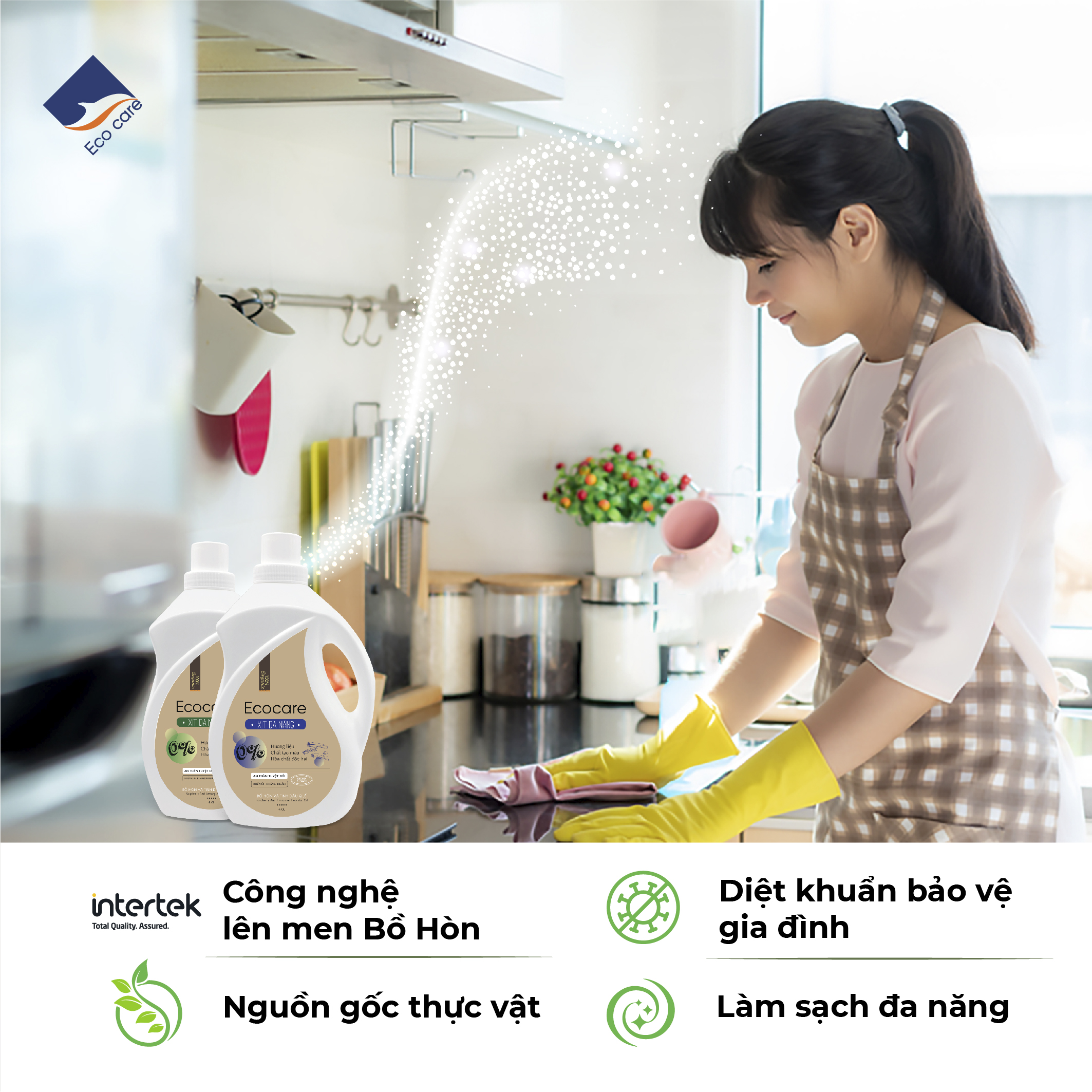 - Phù hợp với nhiều bề mặt: đá, kính, gỗùng được cho bàn ăn và vệ sinh đồ chơi cho trẻ nhỏ. Nên sử dụng cho bề mặt thường xuyên tiếp xúc với da và thức ăn như: mặt bàn ăn, mặt bàn học trẻ em, ghế ăn dặm, mặt bế – Ecocare cam kết: