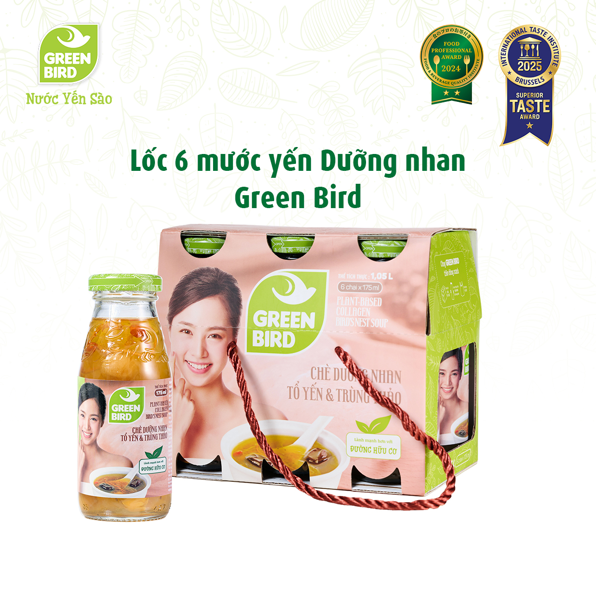 "Là thức uống sử dụng sau khi luyện tập thể thao." TIÊN PHONG DÙNG YẾN SÀO & ĐƯỜNG HỮU CƠ YẾN SÀO HỮU CƠ (Chuẩn Asean Organic) ĐƯỜNG HỮU CƠ (đường không tẩy, cây mía được trồng không dùng phân bón & thuốc trừ sâu) TIÊU DÙNG XANH HƠN Green Bird cùng bạn tiêu dùng xanh hơn bằng cách sử dụng bao bì giấy tái chế, túi nylong sinh học tự hủy và chai thủy tinh. 3. QUY CÁCH ĐÓNG GÓI Lốc 6 chai x 185ml Lốc 10 chai x 185ml 5. HẠN SỬ DỤNG 24 tháng.
