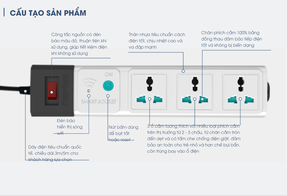 Ổ cắm đa năng cách điện bền đẹp. Chịu nhiệt, chống cháy: 750ºC Chống sét ( có dây tiếp đất) Chiều dài dây điện: 3 mét * CHI TIẾT SẢN PHẨM Chân tiếp xúc với