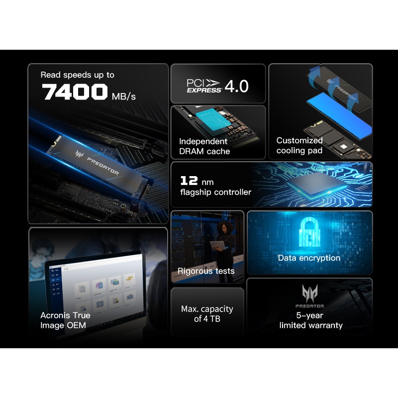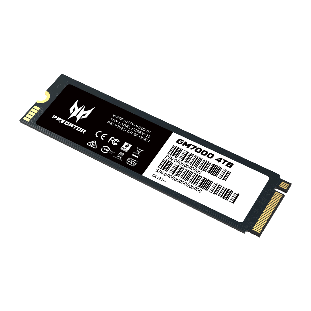 Predator GM7000 M.2 SSD loại bỏ giới hạn tốc độ khi chơi game (với tốc độ đọc lên đến 7400 MB / s) và cung cấp dung lượng lên đến 2 TB. Đây là một ổ cứng SSD có nhiều tính năng, sử dụng PCIe 4.0, bộ điều khiển 8 kênh hàng đầu 12 nm, bộ nhớ đệm DRAM độc lập, Sửa lỗi 4 K LDPC (ECC) và mã hóa AES.