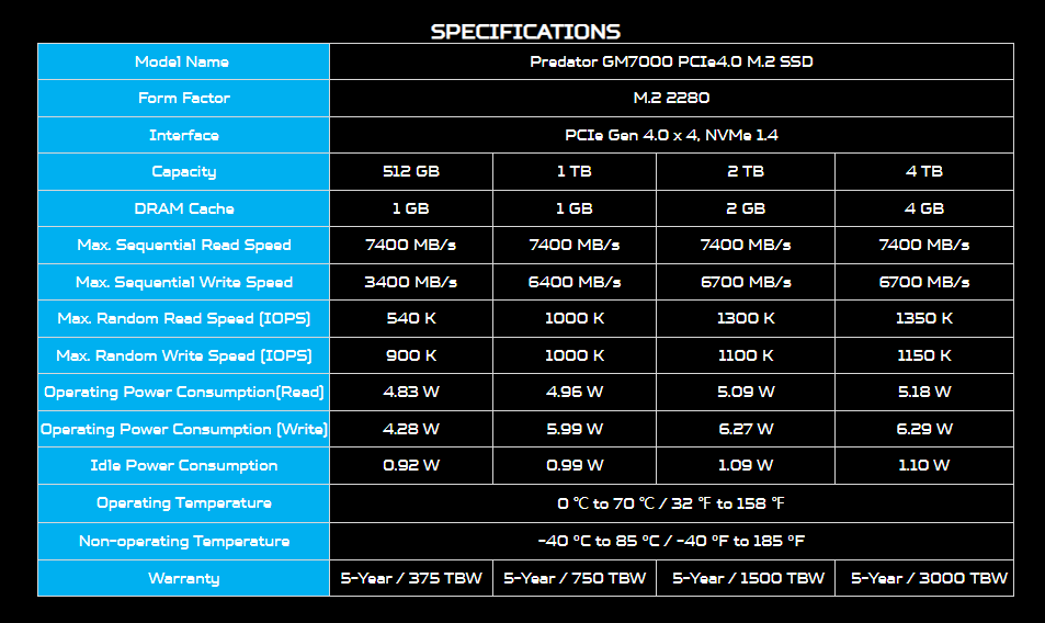 Predator GM7000 M.2 SSD loại bỏ giới hạn tốc độ khi chơi game (với tốc độ đọc lên đến 7400 MB / s) và cung cấp dung lượng lên đến 2 TB. Đây là một ổ cứng SSD có nhiều tính năng, sử dụng PCIe 4.0, bộ điều khiển 8 kênh hàng đầu 12 nm, bộ nhớ đệm DRAM độc lập, Sửa lỗi 4 K LDPC (ECC) và mã hóa AES.