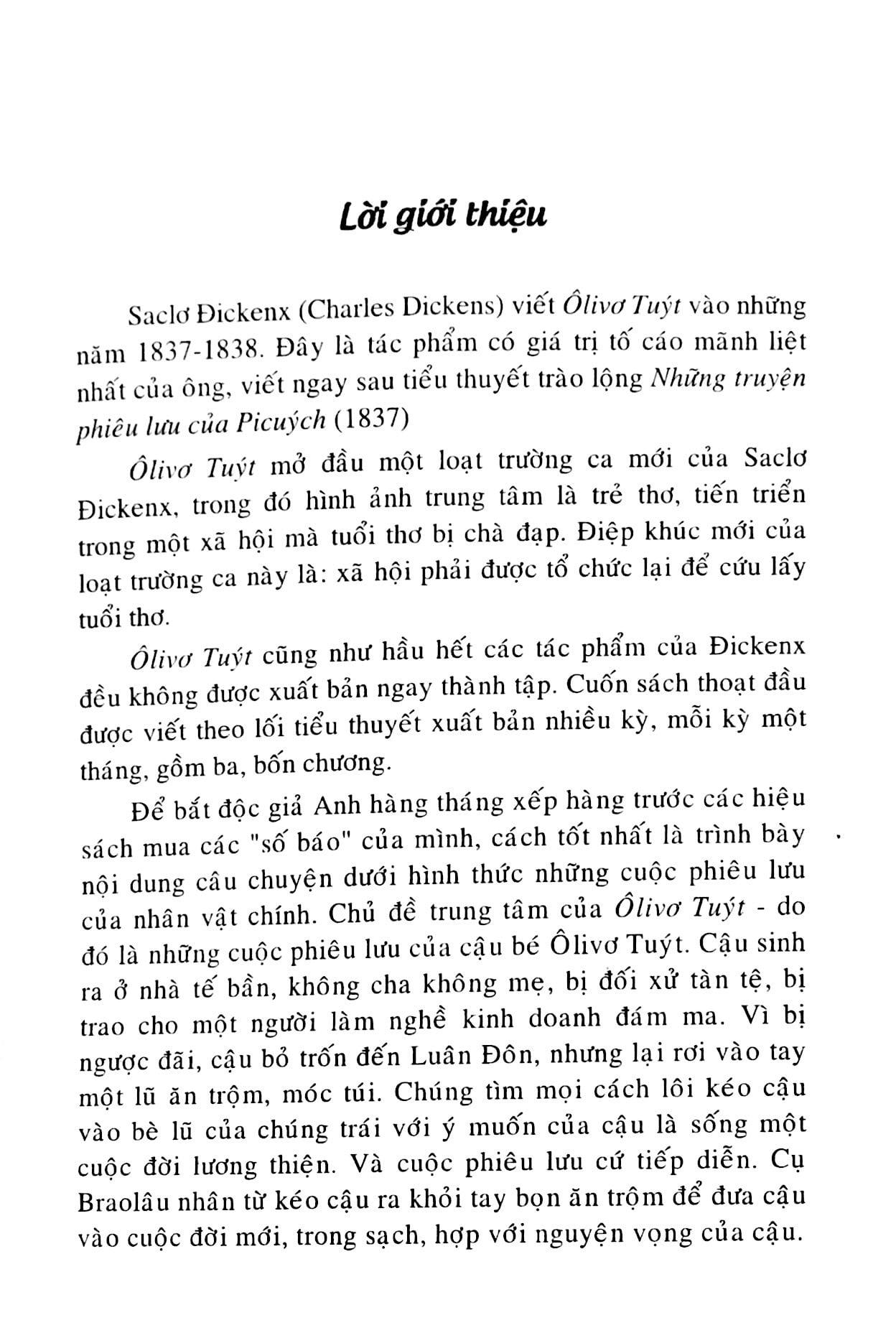 Ôlivơ Tuýt là tác phẩm văn học nổi tiếng của Sáclơ Đickenx (1812-1870) - một tiểu thuyết gia tiêu biểu của nước Anh cuối thế kỷ 19. Truyện của Đickenx thường có cái nhìn thiện cảm đối với những người nghèo khổ như: Đavít Copơphin, Bài hát mừng giáng sinh, Tài sản thừa kế kếch xù...Nhưng ít có tác phẩm nào vừa mang tính hài hước, vừa miêu tả nhân vật sinh động, đặc biệt có giá trị tố cáo mãnh liệt như Ôlivơ Tuýt.