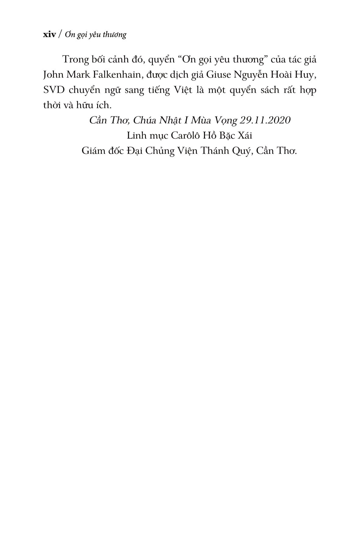 Trong bối cảnh đó, quyển “Ơn gọi yêu thương” của tác giả John Mark Falkenhain, được dịch giả Giuse Nguyễn hoài Huy, svd chuyển ngữ sang tiếng Việt là một quyển sách rất hợp thời và hữu ích.