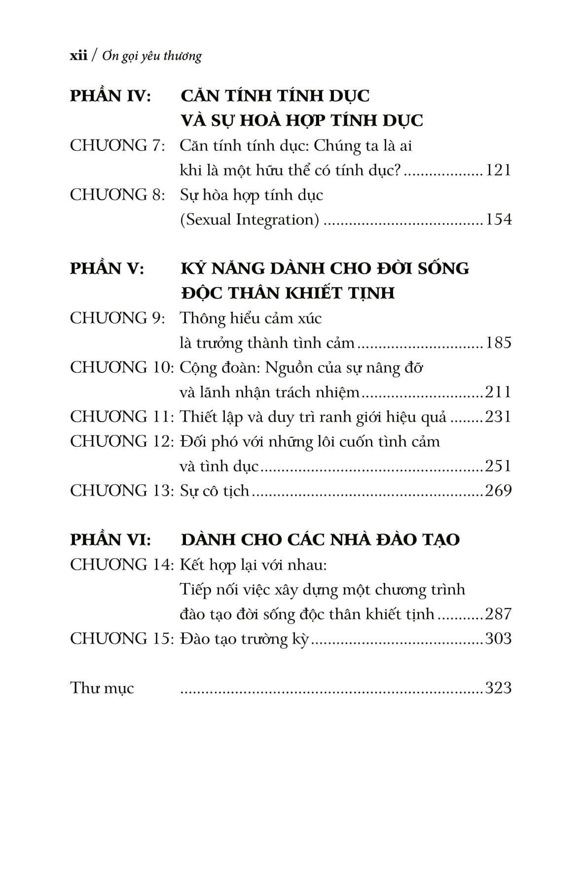 – Phần V : đưa ra những kỹ năng tập sống đời độc thân khiết tịnh. Phần này rất hữu ích vừa cho các nhà đào tạo vừa cho các ứng sinh.