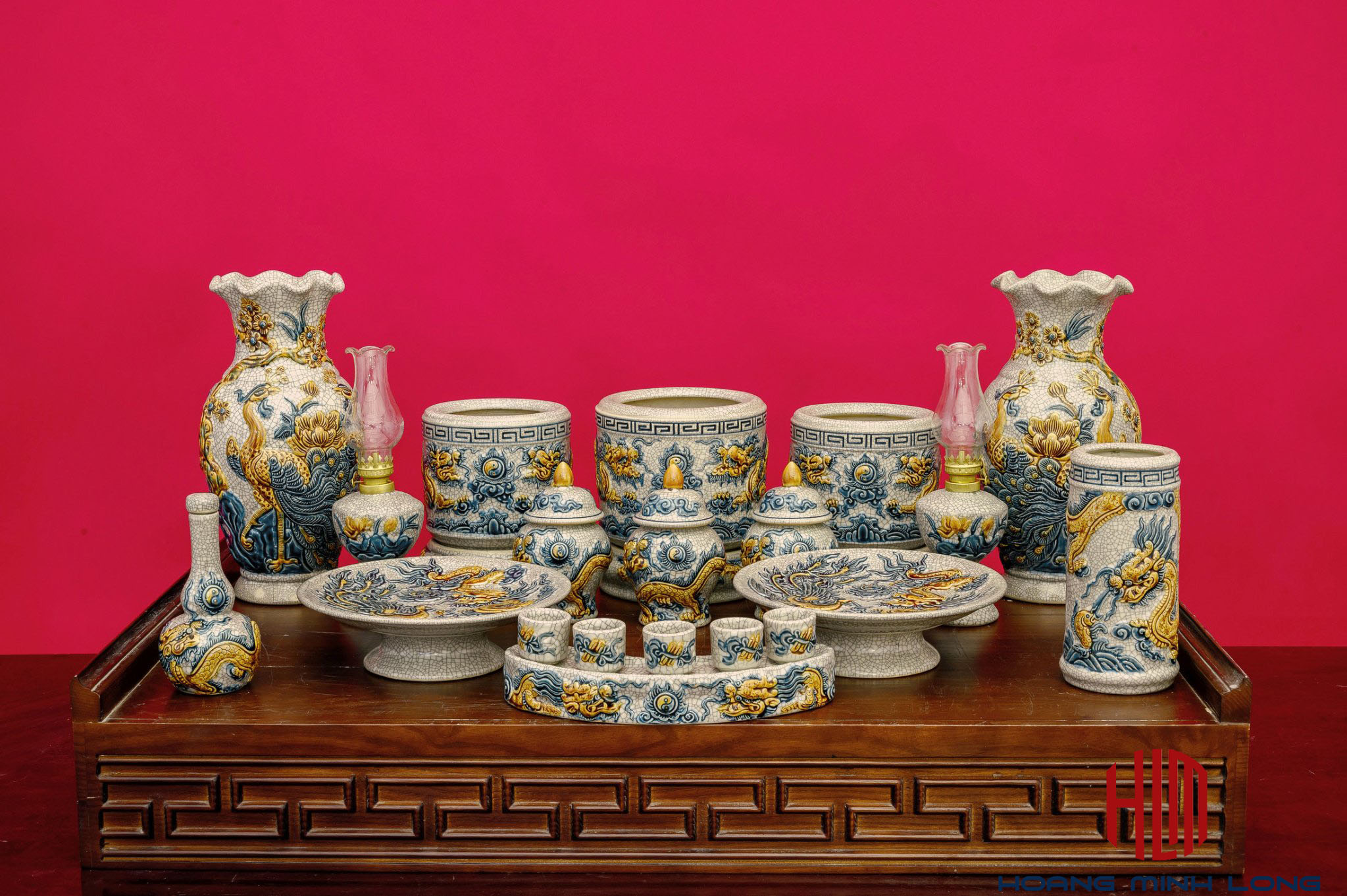 BỘ ĐỒ THỜ MEN RẠN HOA SEN 3D BÁT TRÀNG