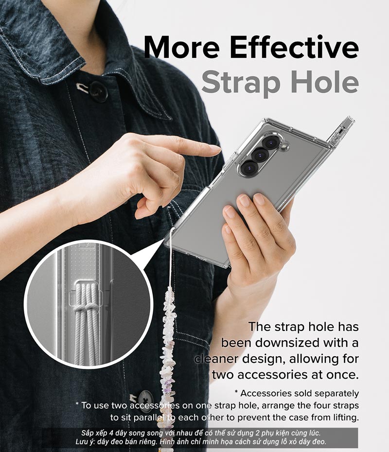 Kích thước lỗ xỏ dây đeo cải tiến cho phép treo (móc) được 2 phụ kiện cùng lúc. Lưu ý: dây đeo được bán riêng. Hình ảnh chỉ minh họa cách sử dụng sản phẩm.