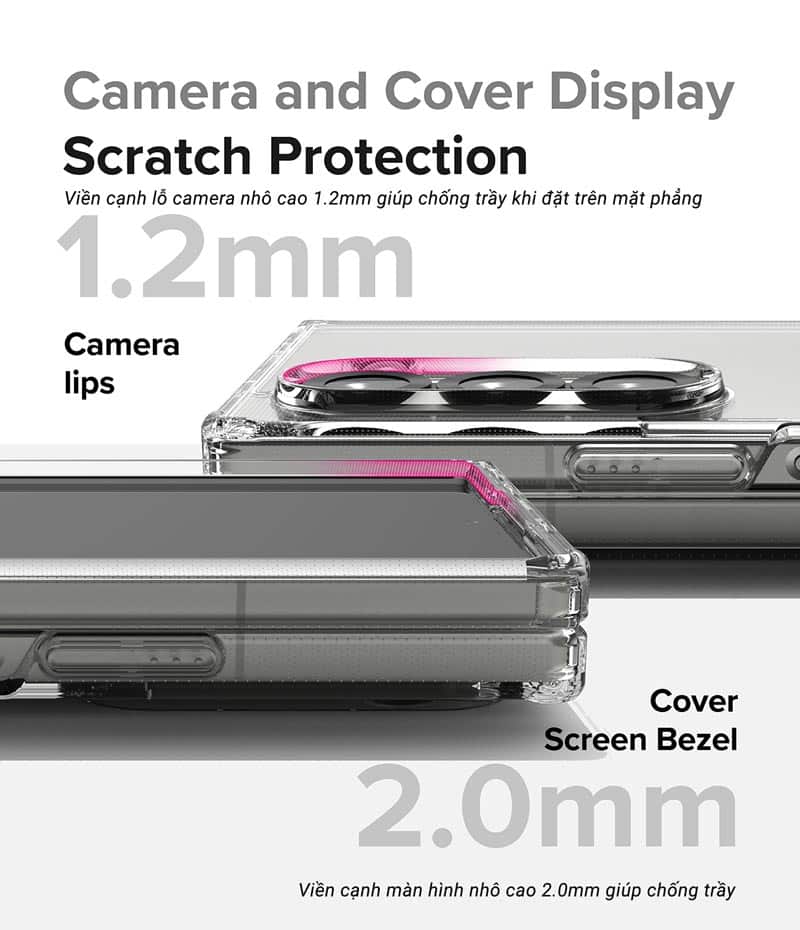 Thiết kế cạnh viền màn hình nhô cao 2 mm và cạnh viền camera nhô cao 1.2 mm giúp chống trầy khi đặt trên mặt phẳng