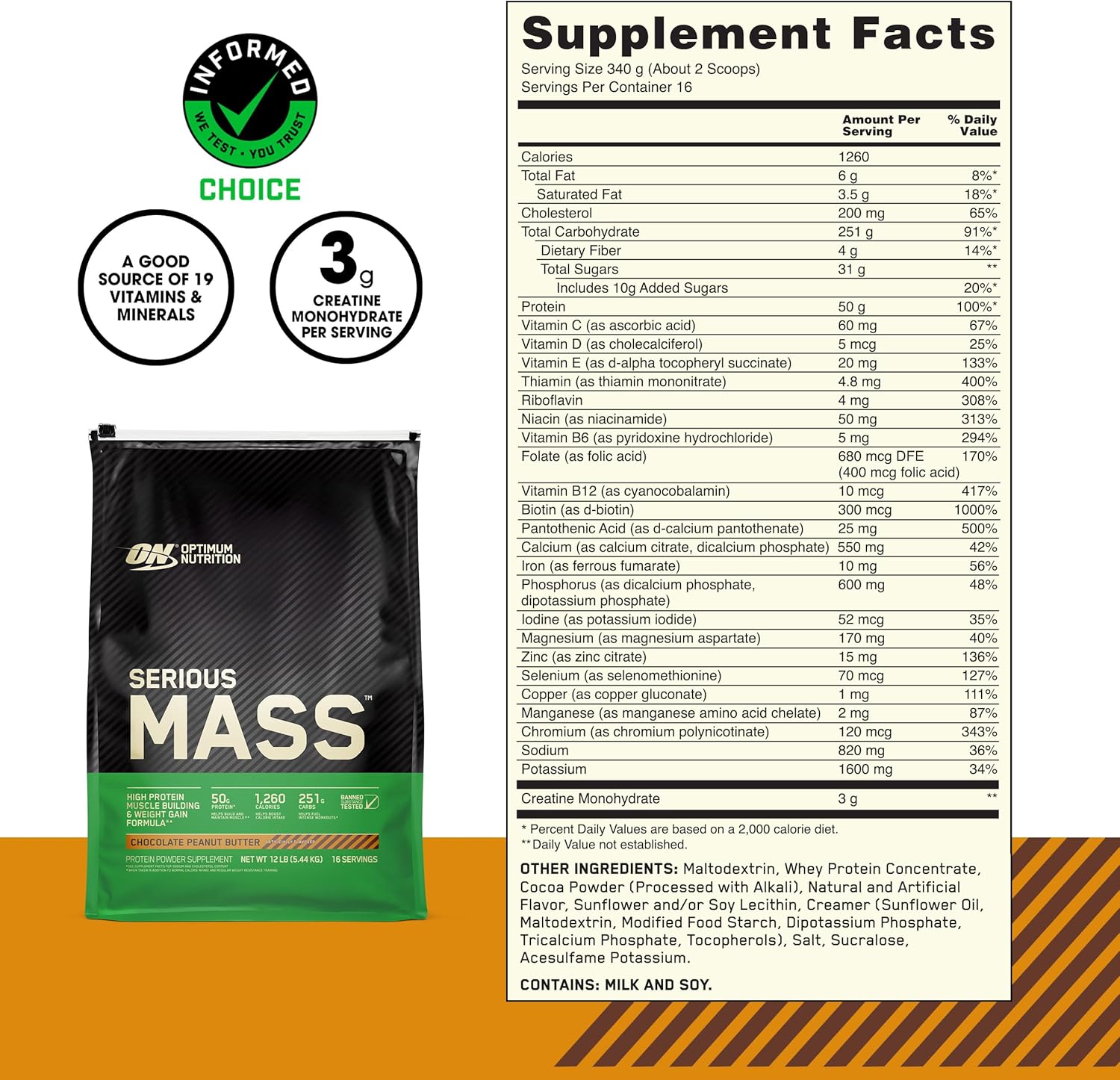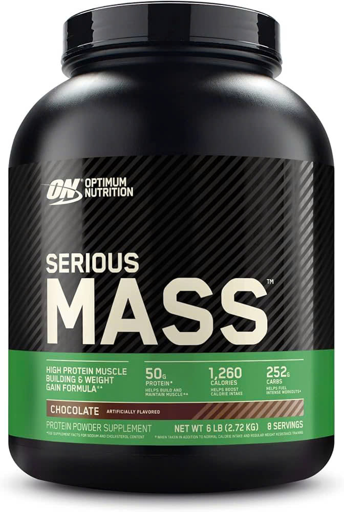 - Serious Mass đến từ Optimum Nutrition giúp cung cấp 1250 Calo, 50gr Protein kết hợp, 252gr Carbonhydrate; 3g Creatine, 500mg Glutamine và Axit Glutamic; 25 Vitamin và khoáng chất cần thiết để người dùng có thể xây dựng cơ bắp và thay đổi vóc dáng hiệu quả.