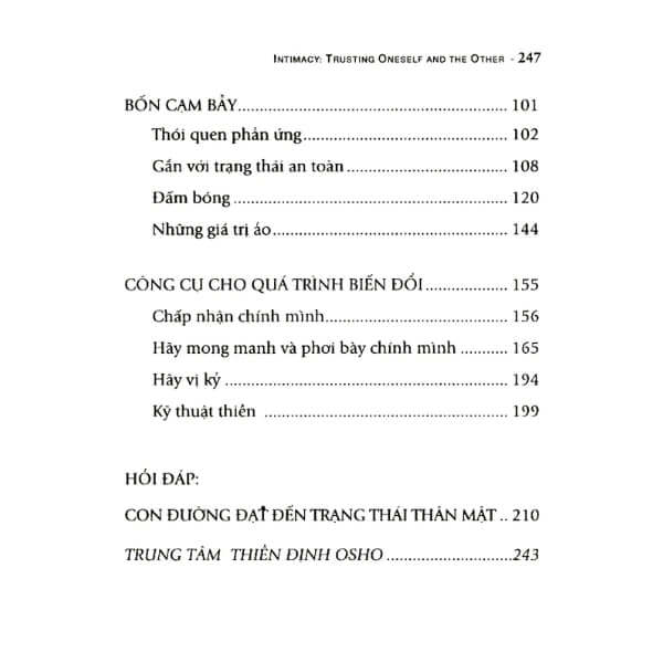 - Thân mật và Sự Sợ Hãi: Osho cho rằng mọi người đều e ngại sự thân mật, bởi nó yêu cầu chúng ta phải phơi bày chính mình, không chỉ trước người khác mà cả trước bản thân mình. Chúng ta thường sợ hãi việc để lộ những điểm yếu, những tổn thương, điều đó khiến con người không dám mở lòng và từ đó giữ khoảng cách với người khác.