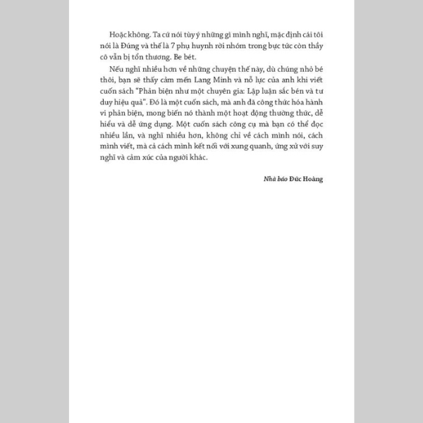 "Phản biện như một chuyên gia: Lập luận sắc bén và tư duy hiệu quả" là tác phẩm ra đời với tham vọng dùng góc nhìn phân tích của chuyên gia kết hợp với kỹ thuật lập luận ngắn gọn mà sắc nét của báo chí để dẫn dắt bạn đọc Việt Nam làm quen với tư duy phản biện theo một cách sống động, đầy hơi thở cuộc sống. Bản thảo được tác giả Lang Minh xây dựng dựa trên kinh nghiệm nhiều năm giảng dạy kỹ năng tư duy phản biện và viết các bài nghị luận xã hội cho mục Góc nhìn của VNExpress, nội dung sách kết hợp kiến thức từ sách vở với các ví dụ từ bài viết của các chuyên gia trên nhiều lĩnh vực.