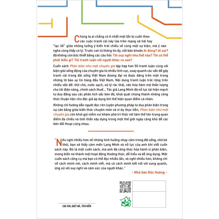 "Phản biện như một chuyên gia - Lập luận sắc bén và tư duy hiệu quả" là tác phẩm ra đời với tham vọng dùng góc nhìn phân tích của chuyên gia kết hợp với kỹ thuật lập luận ngắn gọn mà sắc nét của báo chí để dẫn dắt bạn đọc Việt Nam làm quen với tư duy phản biện theo một cách sống động, đầy hơi thở cuộc sống. Bản thảo được tác giả Lang Minh xây dựng dựa trên kinh nghiệm nhiều năm giảng dạy kỹ năng tư duy phản biện và viết các bài nghị luận xã hội cho mục Góc nhìn của VNExpress, nội dung sách kết hợp kiến thức từ sách vở với các ví dụ từ bài viết của các chuyên gia trên nhiều lĩnh vực.