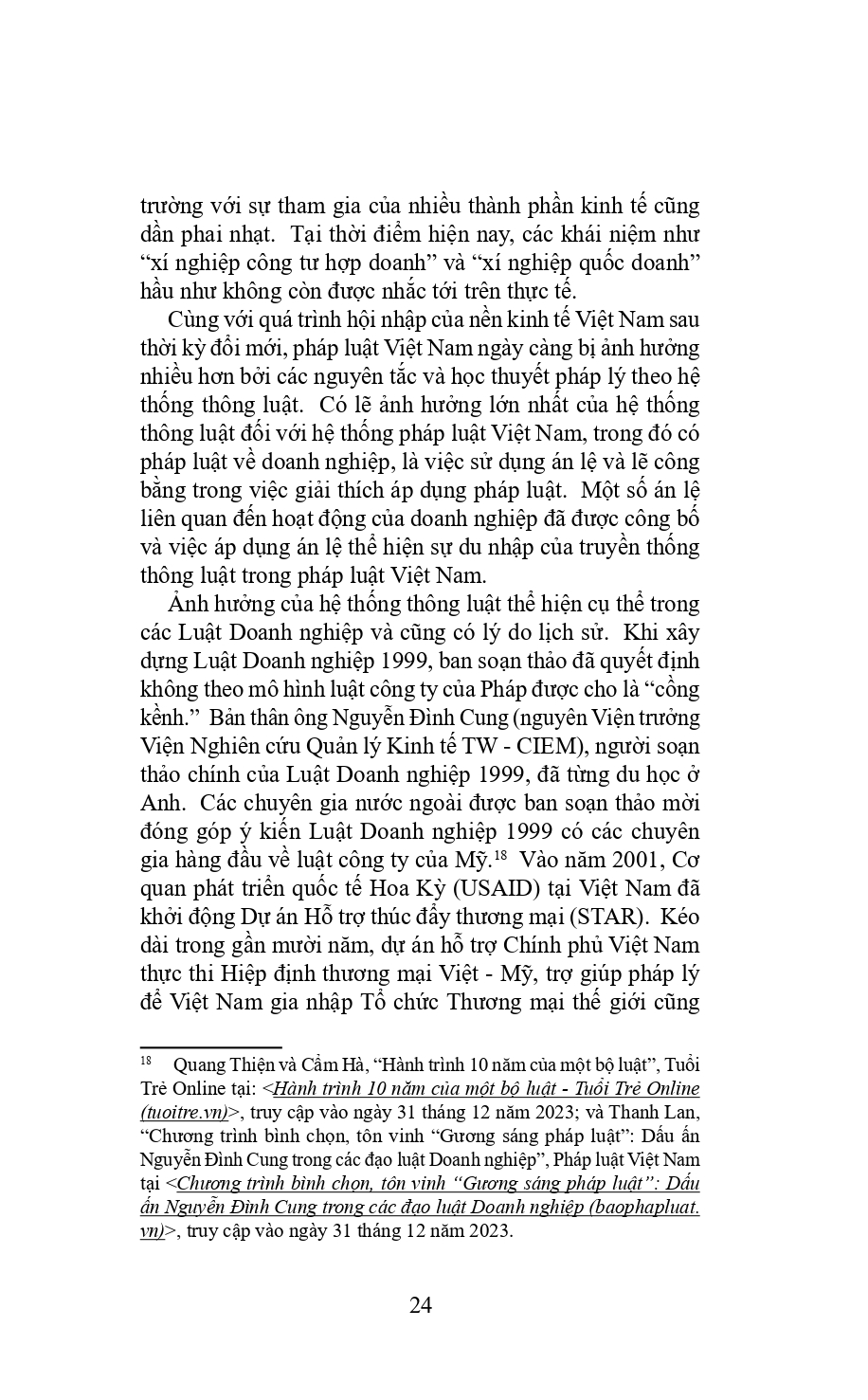 Cuốn sách đầu tiên nghiên cứu một cách có hệ thống các vấn đề pháp luật về doanh nghiệp của Việt Nam từ cả góc độ lý thuyết và thực tiễn, tập trung vào các giao dịch mua bán doanh nghiệp và tài chính-ngân hàng có yếu tố nước ngoài dựa trên kinh nghiệm hành nghề thực tế của luật sư Trương Nhật Quang. Công ty luật YKVN nơi tác giả làm việc là một trong các công ty luật hàng đầu Việt Nam và tham gia tư vấn trong nhiều giao dịch giao dịch mua bán doanh nghiệp và tài chính-ngân hàng có yếu tố nước ngoài quan trọng nhất trên thị trường.
