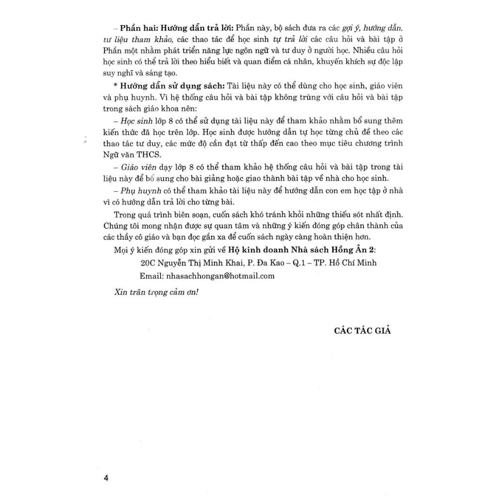 - Học sinh lớp 8 có thể sử dụng cuốn sách này để tham khảo nhằm ôn tập và bổ sung các kiến thức đã học trên lớp. Học sinh được hướng dẫn tự học từng chủ đề theo các thao tác tư duy, các mức độ cần đạt từ thấp đến cao theo mục tiêu của Chương trình môn Ngữ văn THCS.