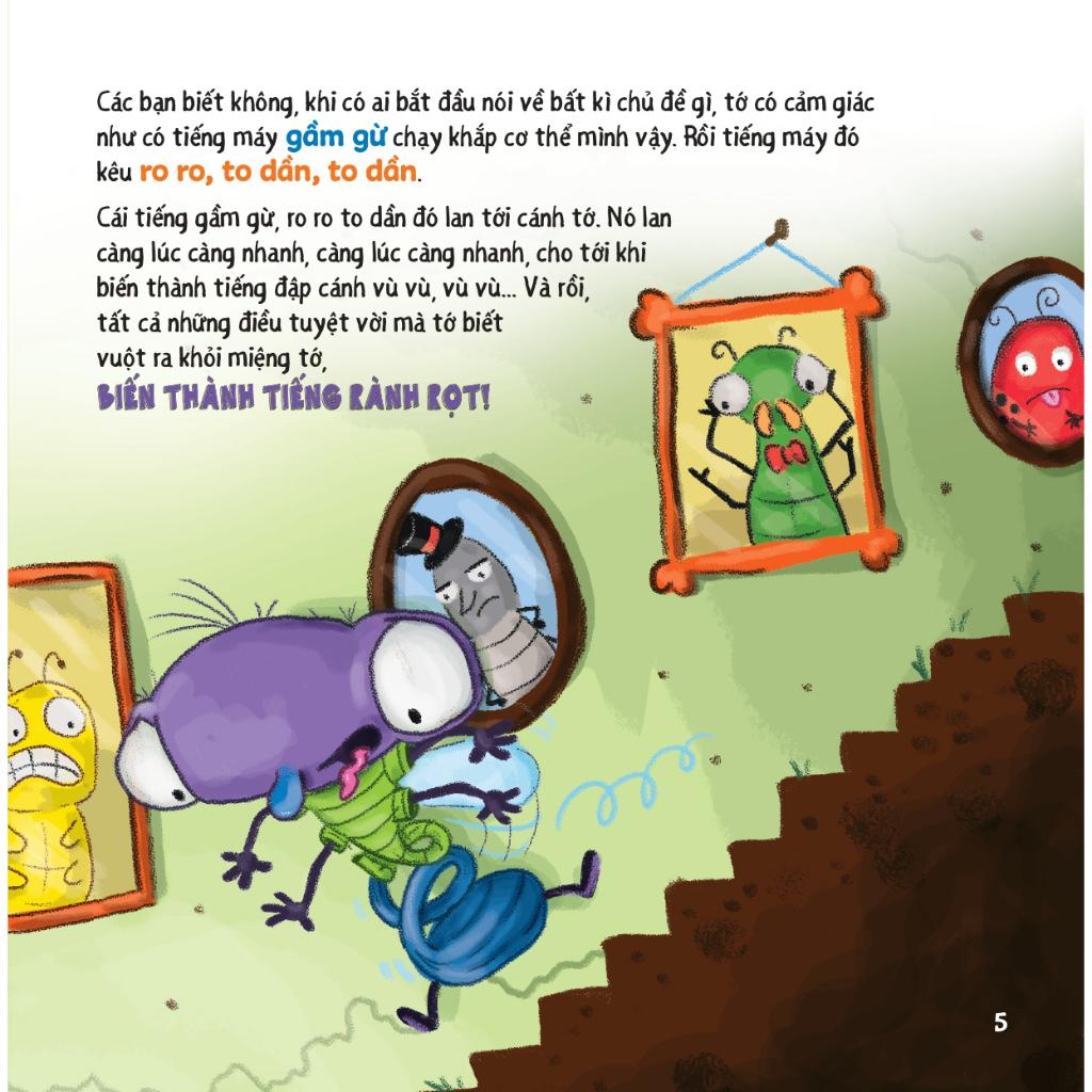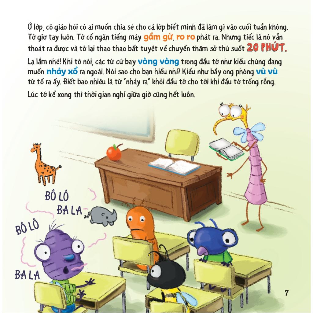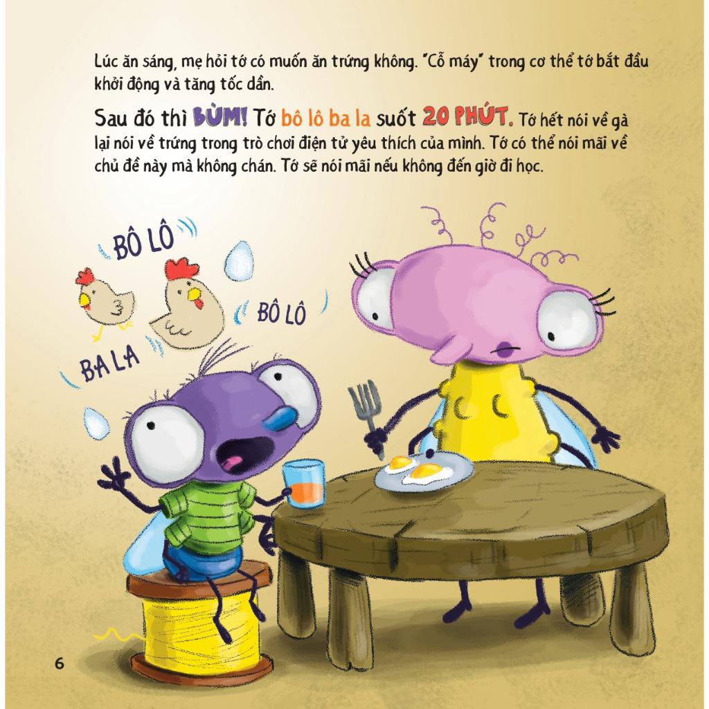 Đừng nói như máy!: Câu chuyện kể về bạn ruồi nhỏ đáng yêu rất thích nói chuyện và cậu có thể nói như máy, nói không ngừng nghỉ, không dừng lại để lắng nghe bất kì ai nói. Thế rồi ngày nọ, ruồi nhỏ đau đầu, choáng váng khi gặp một cô bạn còn hay nói hơn mì Lúc ấy, ruồi nhỏ đã hiểu ra: Khi trò chuyện, cậu nên nói ít hơn và lắng nghe nhiều hơn.