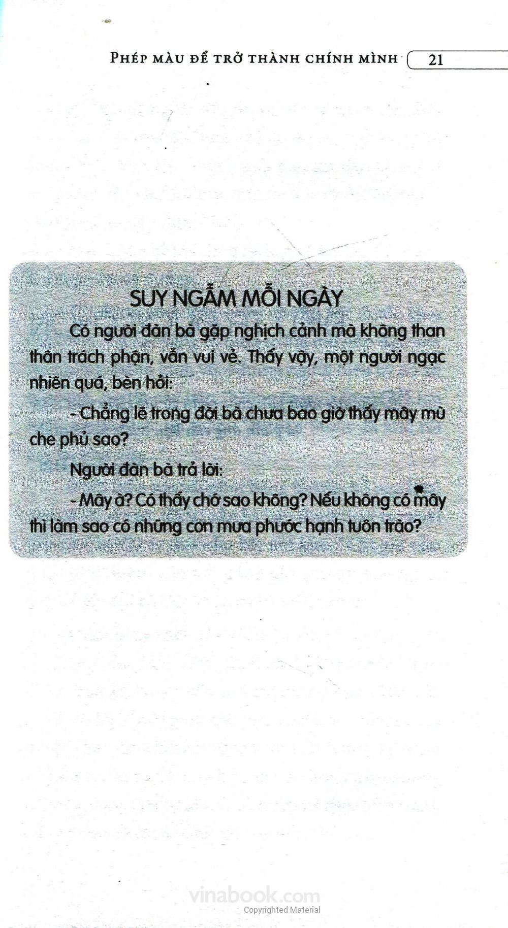 Cuốn sách Phép Màu Để Trở Thành Chính Mình chính là những đúc kết thành công qua những nỗ lực vượt khó của tác giả, từ khi bắt đầu lập nghiệp cho đến bây giờ - là Tổng Giám đốc New Toyo Việt Nam. Là phụ nữ, con đường lập nghiệp không hề đơn giản, và càng không hề đơn giản hơn đối với bản thân tác giả - là một phụ nữ làm việc trong một môi trường mà chỉ có sức lực người đàn ông nhiều khi mới đảm đương nổi. Đối với công việc, chị không hề có kinh nghiệm, càng không được đào tạo trước đó. Vì thế, chị vừa là thực tập sinh vừa là thầy giáo cho chính mình; ngã từ đâu đứng lên từ đấy; sai xót chỗ nào chỉnh sửa tại chỗ đó. Bài học mỗi ngày của chị là rút kinh nghiệm và ngày mai phải tốt hơn ngày hôm nay.