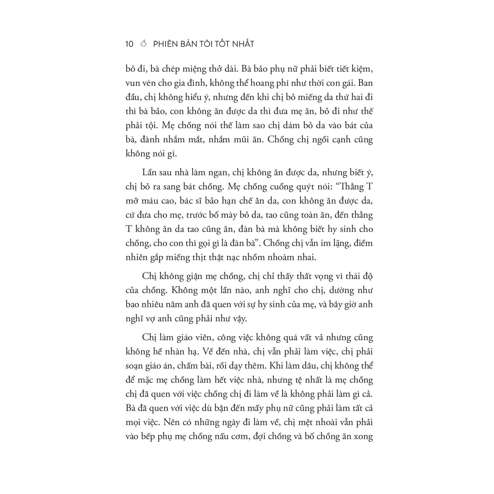 - Nếu bạn là nam giới, khi cầm trên tay cuốn sách này, bạn cũng sẽ tìm được điều gì đó thú vị, thay đổi góc nhìn của bạn, phá vỡ những định kiến quen thuộc. TÓM TẮT SÁCH Phiên bản tôi tốt nhất, được tinh chỉnh từ cuốn Lợi thế đàn bà, đổi mới và bổ sung rất nhiều nội dung giá trị, dù vẫn bám vào những câu chuyện, bài học xoay quanh người phụ nữ, nhưng nó không hẳn chỉ dành riêng cho phụ nữ. Phiên bản tôi tốt nhất dành cho bất kỳ ai muốn tìm thấy chính mình, hiểu rằng mình là người duy nhất chịu trách nhiệm cho mọi thứ đến với mình trong đời, nỗ lực để hoàn thiện mình mỗi ngày. Như mọi cuốn sách khác của Giang Đinh, Phiên bản tôi tốt nhất hướng đến thay đổi tư duy. Bởi thay đổi tư duy, bao giờ cũng thế, chính là thay đổi cuộc đời! CUỐN SÁCH CÓ GÌ ĐẶC BIỆT