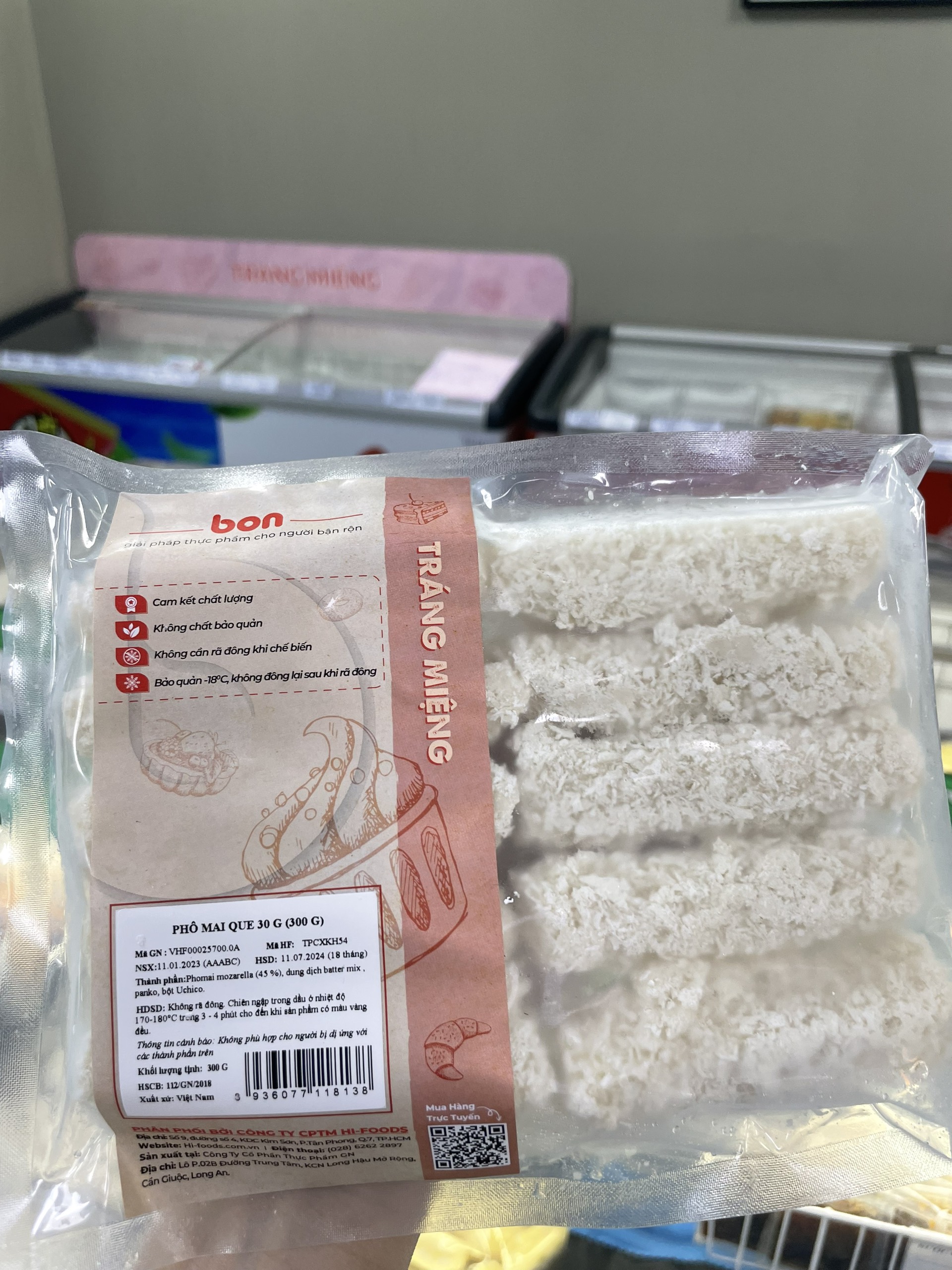 Với sản phẩm tươi sống, trọng lượng thực tế có thể chênh lệch khoảng 10%. ĐỊNH LƯỢNG: 300g/gói THÀNH PHẦN: Phomai mozzarella (45%), batter mix, panko, bột Unicho CÁCH CHẾ BIẾN: Không rã đông.