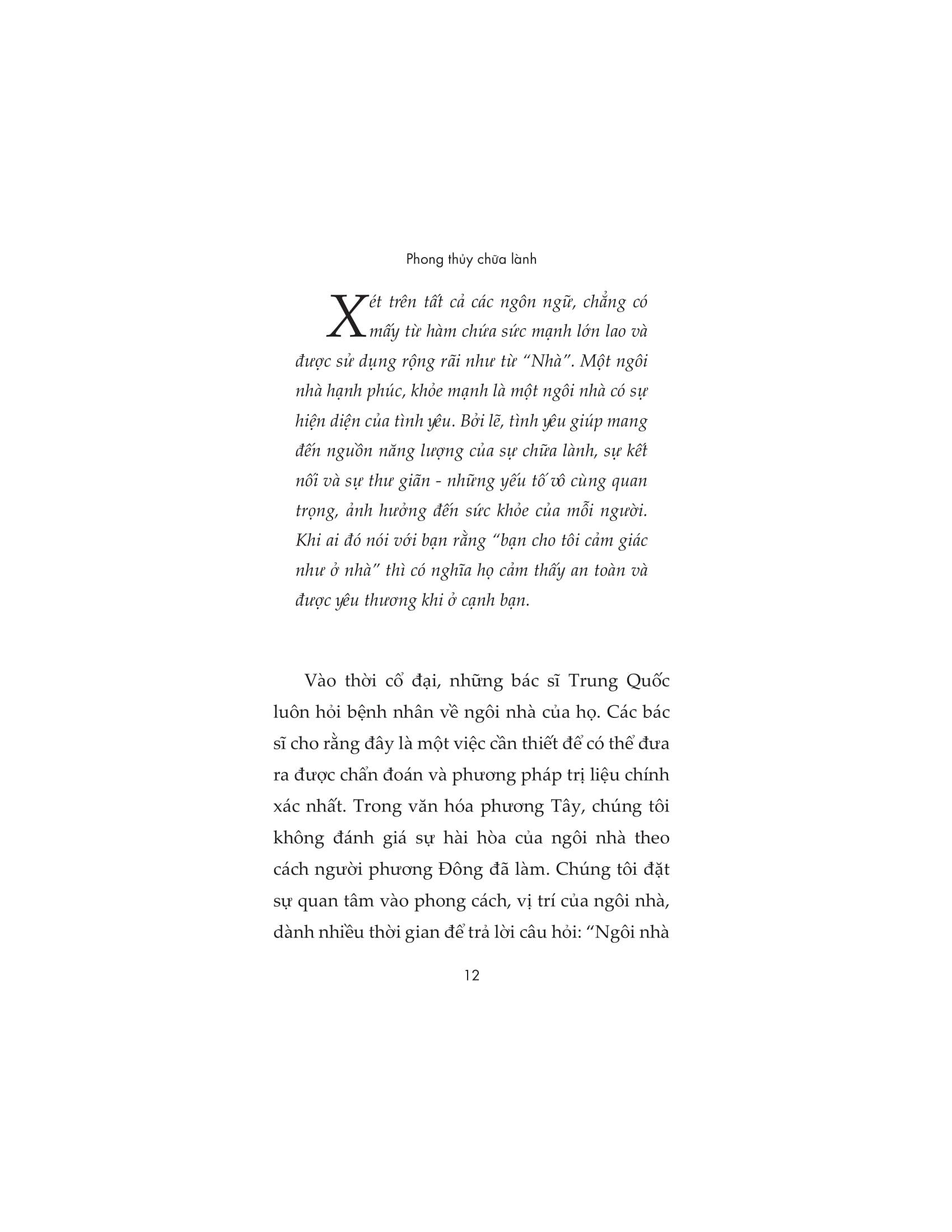 Thế giới rộng lớn và vô cùng phức tạp. Chúng ta gần như không thể kiểm soát được sự hỗn loạn liên tục của nó. Trong cuốn sách “Phong thủy chữa lành” sẽ cung cấp cho bạn cách áp dụng minh tuệ cổ xưa cho một ngôi nhà hiện đại. Xây dựng một ngôi nhà để che chở và chữa lành cho mỗi thành viên trong gia đình là bản chất của phong thủy.
