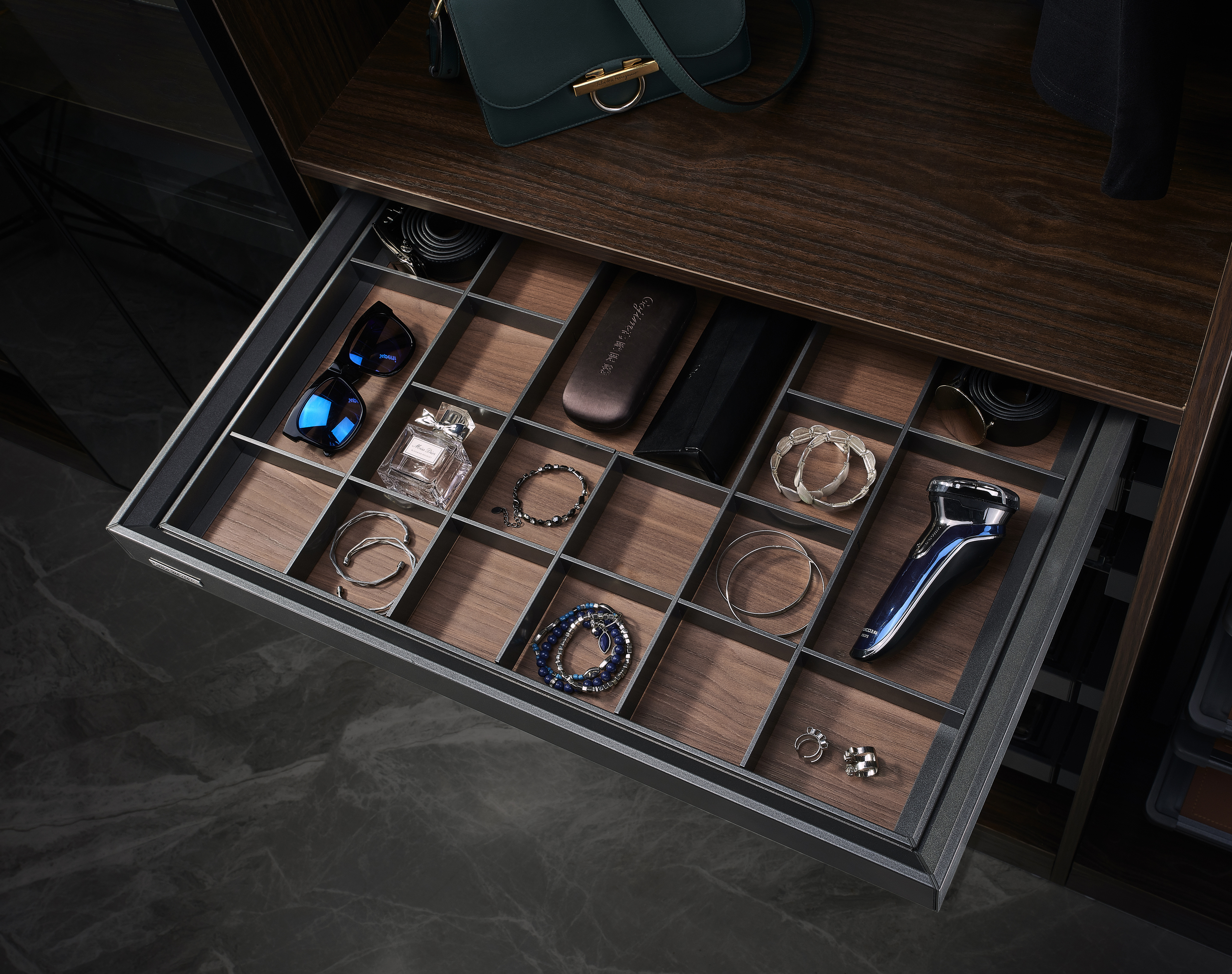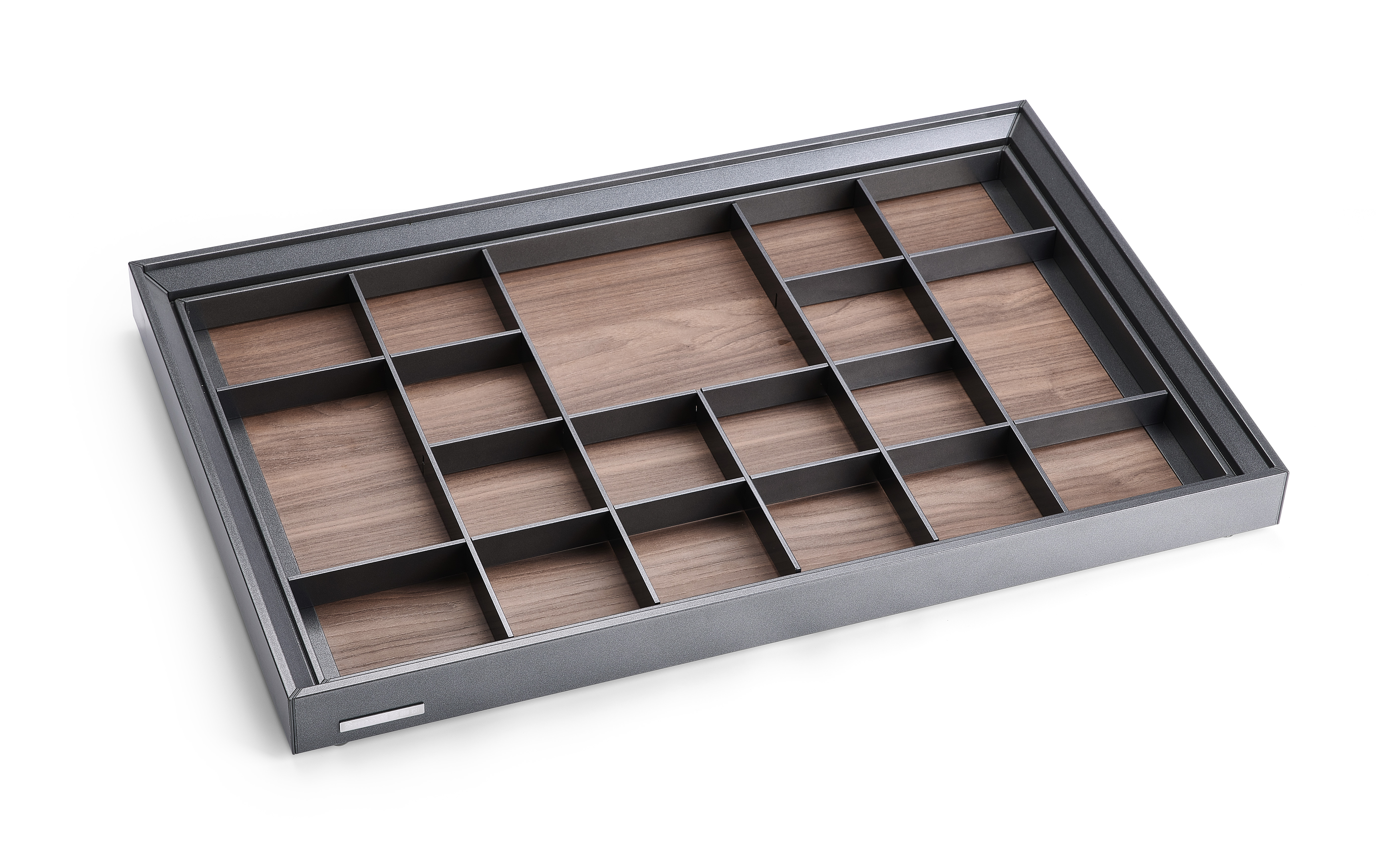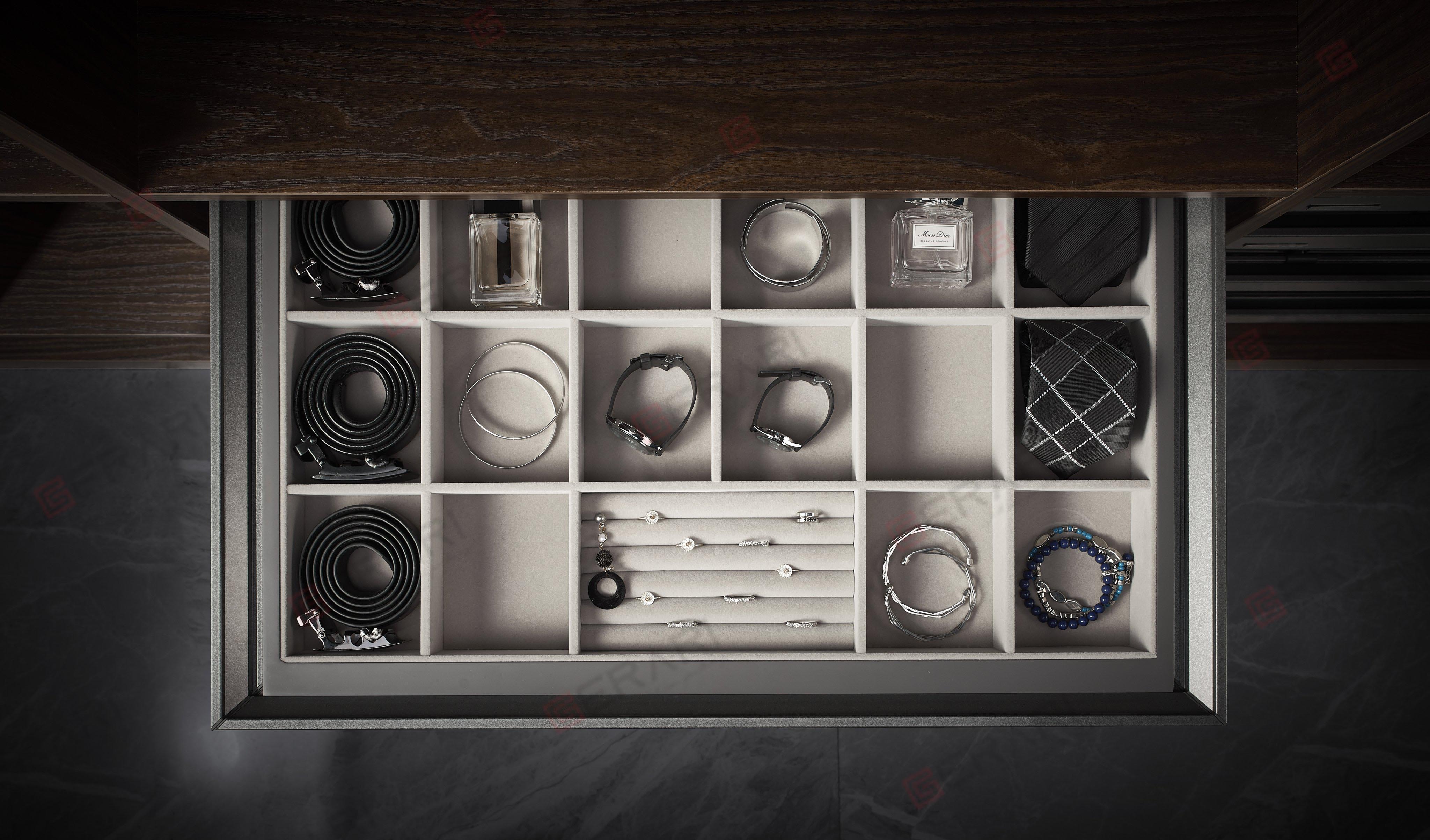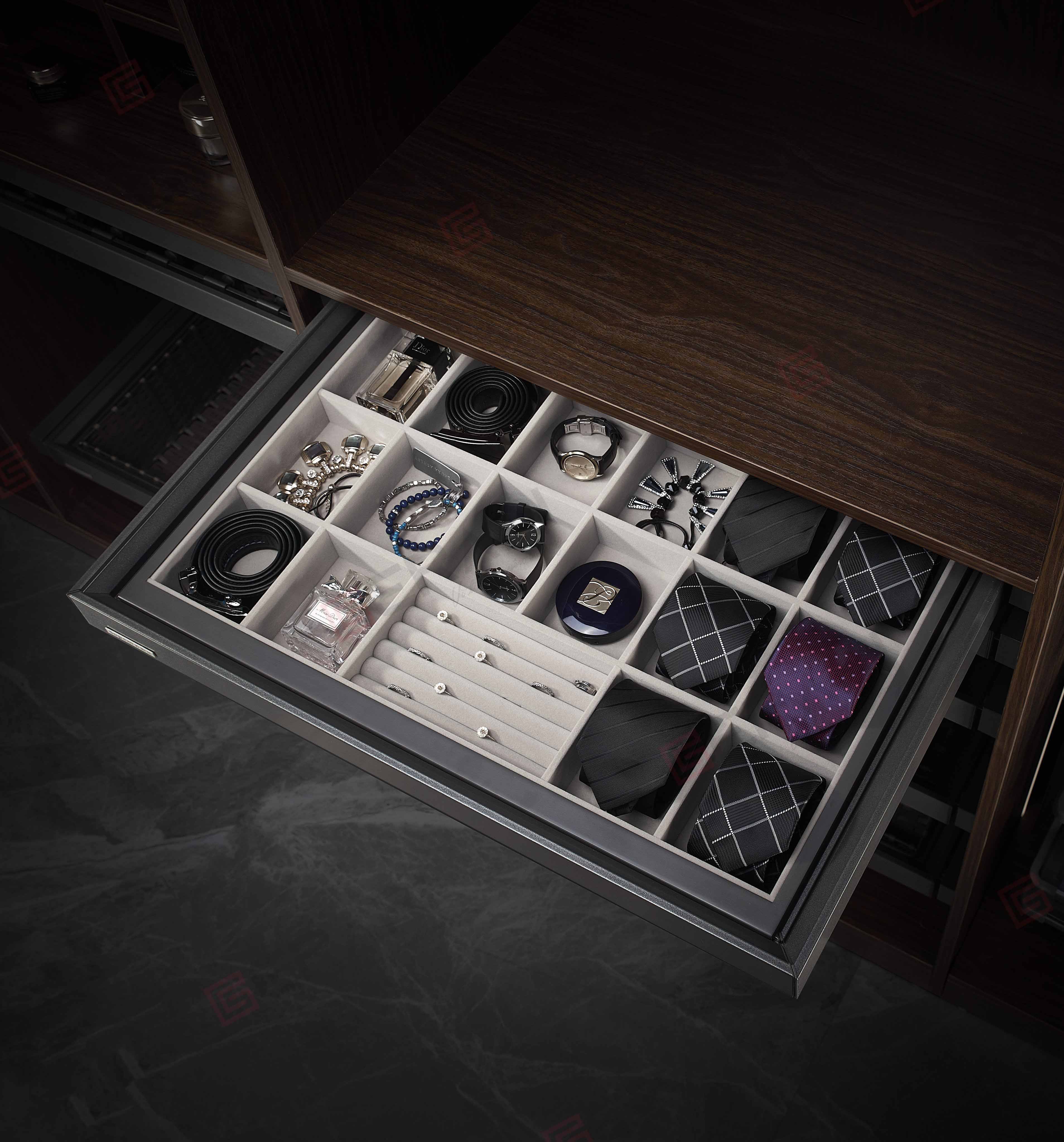 ✨Phụ kiện của tủ áo (Kệ để đồ trang sức ray giảm chấn có vách ngăn, bề mặt bọc da dòng đương đại Grey mã GW001.800/ GW001.800A)