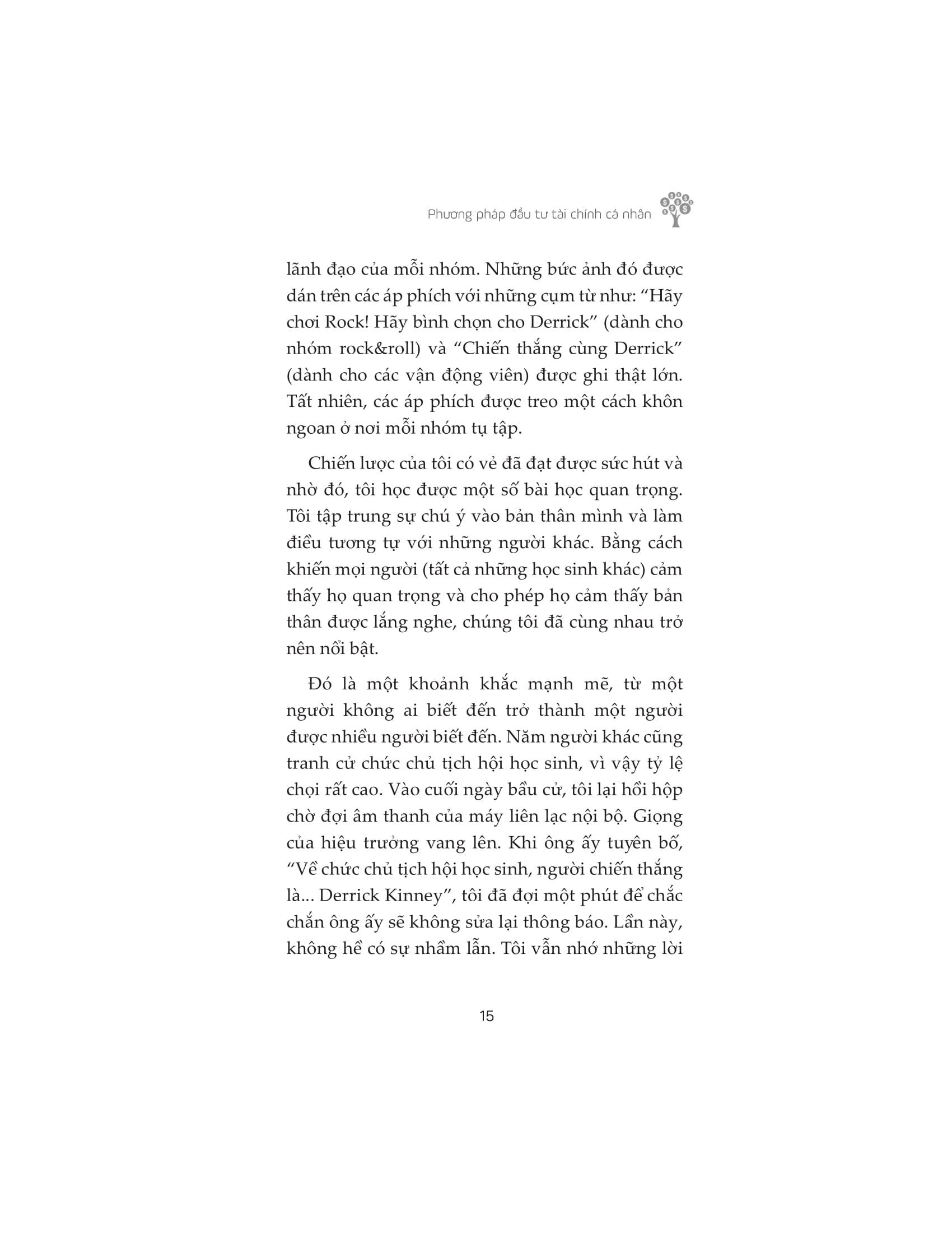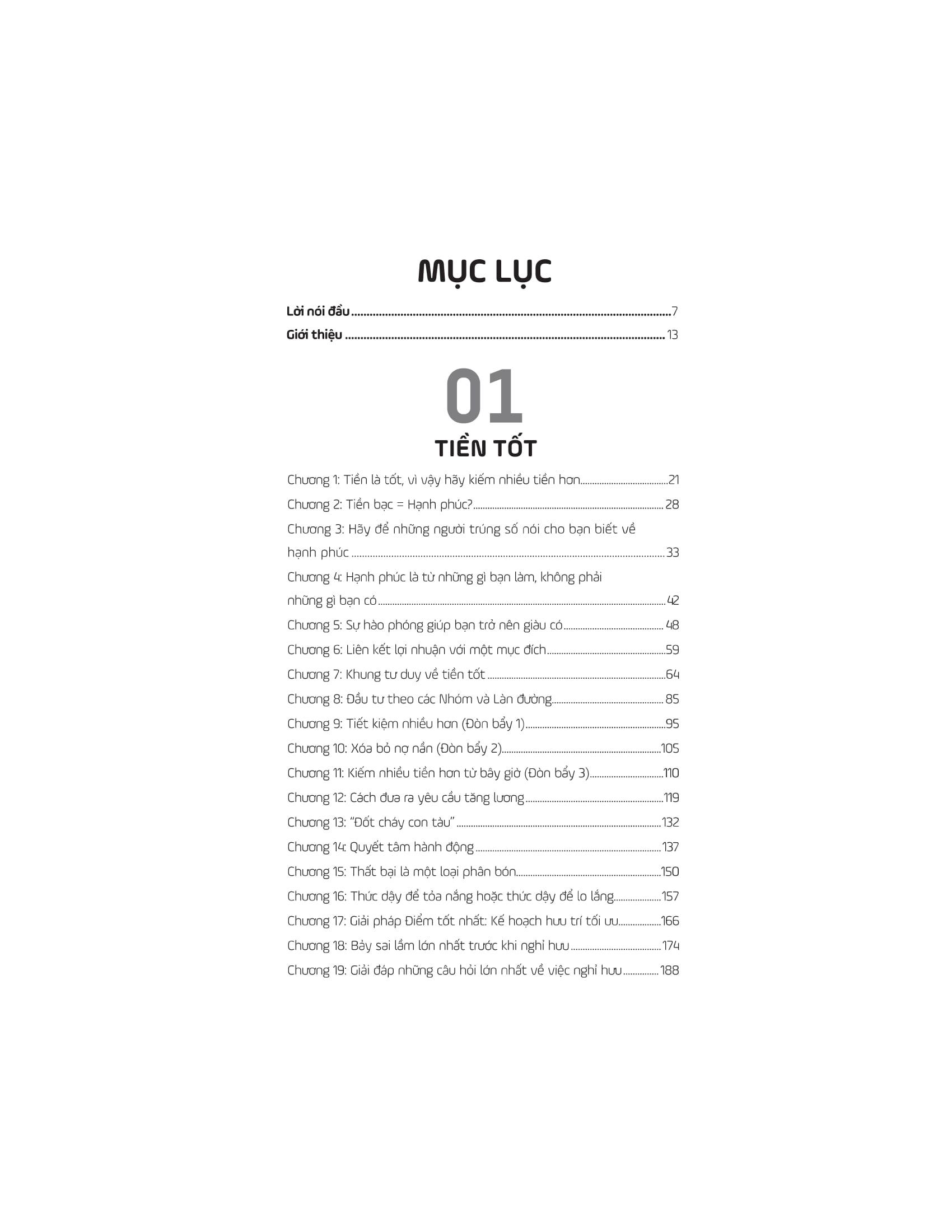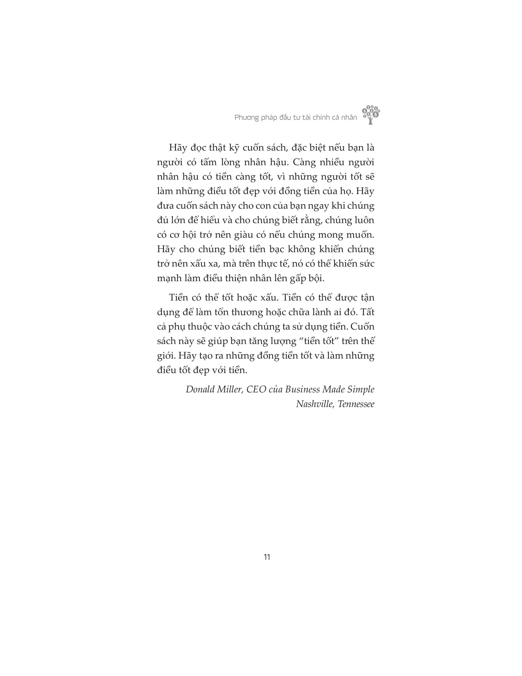 Bạn ghét nợ nần, bạn ghét chứng kiến gia đình cãi vã vì thiếu tiền, bạn ghét cuộc sống không được làm những điều m.ình thích chỉ vì không có đủ tài chính, và rồi bạn nghĩ tiền thật xấu xa khi khiến cuộc sống trở nên áp lực. Nhưng rõ ràng, bạn cũng biết tiền không hề xấu. Và bạn vẫn luôn muốn có nhiều tiền hơn để khiến cuộc sống của bản thân cùng gia đình tốt đẹp hơn. Vậy sẽ thế nào nếu bạn vừa kiếm được nhiều tiền hơn, vừa có một quỹ tiết kiệm lớn hơn, vừa xây dựng được những khoản đầu tư hiệu quả, đồng thời tạo ra những tác động tích cực cho thế giới và giúp ích cho hàng ngàn người khốn khổ khác? Đó là một ý tưởng tuyệt vời mà bạn hoàn toàn có thể thực hiện ngay hôm nay. Và “Phương pháp đầu tư tài chính cá nhân” sẽ giúp bạn làm điều đó. Cuốn sách được viết bởi cố vấn tài chính nổi tiếng, Derrick Kinney, sẽ giúp bạn học được cách kiếm nhiều tiền hơn – tiết kiệm nhiều hơn – trao đi nhiều hơn để tạo ra ý nghĩa lớn lao cho xã hội, bằng cách cung cấp một kế hoạch hành động cụ thể bao gồm: 5 tư duy về tiền 3 đòn bẩy của tiền: Tiết kiệm nhiều hơn, xóa nợ và kiếm nhiều tiền hơn 7 bài tập để tự xây dựng mục đích cống hiến cho xã hội bằng tiền của bạn Đừng chỉ kiếm tiền, hãy kiếm những đồng tiền tốt để cuộc sống của bản thân tốt hơn và để cộng đồng cùng trở nên tốt đẹp hơn. Hãy lật giở cuốn sách này và khám phá cuộc cách mạng tiền tốt ngay hôm nay! Về tác giả Derrick Kinney là Giám đốc điều hành của Tổ chức Good Money Framework và là người dẫn chương trình podcast nổi tiếng về Tiền tốt với niềm tin rằng tiền không xấu và những người tốt nên có nhiều tiền hơn. Kinney đã hợp tác cùng các nhà lãnh đạo kinh doanh và các nhà tư tưởng có ảnh hưởng để truyền cảm hứng kiếm nhiều tiền hơn và sử dụng tiền với mục đích tốt. Nổi tiếng với khả năng biến các chủ đề tài chính phức tạp trở nên dễ hiểu, Kinney luôn là khách mời được săn đón trên các phương tiện truyền thông địa phương và quốc gia như CNBC, FOX News, CNN, FOX Business, PBS, Cheddar News, Wall Street Journal, Để biết thêm các mẹo hay kiếm tiền, bạn có thể kết nối với anh ấy qua ram @DerrickTKinney. Một số trích dẫn “Tiền chỉ làm cho chúng ta sống đúng với bản chất của m.ì Nếu khi có ít tiền, bạn vẫn là người rộng lượng, vậy hãy tưởng tượng sẽ ra sao khi bạn trở nên giàu có. Bạn sẽ rộng lượng hơn nữa, hào phóng hơn nữa, trở thành một người đặc biệt và có tầm ảnh hưởng lớn hơn trong cộng đồng”. (John O'Leary – Chương 3) “Nếu bạn có thể cười nhiều hơn; giành được sự kính trọng của những người thông minh và tình cảm của trẻ em; có được sự đánh giá cao của những nhà phê bình trung thực và chịu đựng sự phản bội của những người bạn giả dối; đánh giá cao vẻ đẹp, tìm kiếm điều tốt nhất ở người khác; góp phần tạo ra một thế giới tốt đẹp hơn. Đó có thể là việc giúp đỡ một đứa trẻ khỏe mạnh, hay một mảnh vườn, hay một hoàn cảnh xã hội khác; và biết được rằng sự tồn tại của bạn giúp cho một cuộc sống khác tốt đẹp hơn. Có được những điều này là bạn đã thành công rồi”. (chương 7) Cuộc sống chứa đầy nghịch cảnh và sai lầm. “Chúng ta không thể quay lại và tập trung vào những gì đã mất. Chúng ta phải nhìn về phía trước. Bạn có thể vươn lên trong nghịch cảnh, hoặc trở nên sa sút. Bạn có thể thức dậy và tỏa nắng mỗi ngày hoặc thức dậy và chỉ bắt đầu lo lắng”. Đó là lựa chọn của bạn. (Jon Gordon) Người có tầm ảnh hưởng không phải là người chỉ ra cách một người vấp ngã hay những việc có thể làm họ tốt hơn. Danh tiếng thuộc về người thực sự tham gia cuộc đấu, với khuôn mặt hoen ố vì bụi, mồ hôi và máu. Người chiến đấu dũng cảm đã có những sai lầm, những thiếu sót, vì không nỗ lực nào mà không trải qua lỗi lầm và thiếu sót. Nhưng ai đã thực sự nỗ lực để làm những việc đó? Ai sở hữu những đam mê vĩ đại, những sự sùng kính vĩ đại, người dâng hiến m.ình cho chính nghĩa xứng đáng? Và ai là người hiểu rõ nhất về chiến thắng hiên ngang cũng như thất bại tồi tệ nhất? Nếu thất bại, ít nhất hãy thất bại trong trạng thái dám đương đầu thách thức, để không bao giờ trở thành những linh hồn lạnh lùng và nhút nhát, không biết đến cái gọi là chiến thắng hay thất bại. (Teddy Roosevelt) Đó là một khoảnh khắc tuyệt đẹp khi ai đó thức dậy với thực tế này, khi họ nhận ra Chúa đã tạo ra họ để người khác có thể yêu thích quý họ chứ không phải chỉ chịu đựng họ. (Donald Miller) Một số nhận xét “Nếu bạn hai mươi tuổi và đang trả chi phí học đại học, hãy đọc cuốn sách này. Nếu bạn bốn mươi và đang dạy con m.ình về tiền bạc, hãy đọc cuốn sách này. Nếu bạn sáu mươi và