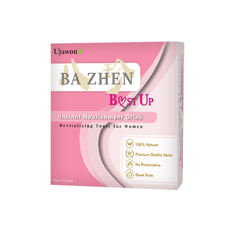 Nước uống thảo mộc Ba Zhen Ujuwon Bust Up Tăng cường vòng 1, sắc vóc ngọc ngà (8 gói/hộp) Ujuwon Ba Zhen Bust Up (còn gọi là Bát Trân thang của người Đài Loan) là loại thuốc bổ giúp phục hồi sức khỏe là loại thuốc bổ cho phái nữ hàng đầu Đài Loan, được điều chế từ các loại thảo mộc thượng hạng với lợi ích tăng cường hiệu quả làm săn chắc và nâng vòng 1 dành cho phái nữ. Bát Trân Thang nay đã có thể dùng ngay tức thì được đóng gói tiện lợi dành cho những người phụ nữ hiện đại. Bạn muốn bồi bổ cơ thể nhưng lại sợ nóng trong người?