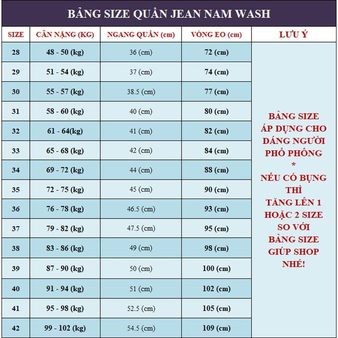 CÁCH CHỌN SIZESize 28 (Từ 50 - 55kg Cao Dưới 1m70)Size 29 (Từ 55 - 68kg Cao Dưới 1m70)Size 30 (Từ 58 - 61kg Cao Dưới 1m70)Size 31 ( Từ 61- 63kg Cao Dưới 1m70)Size