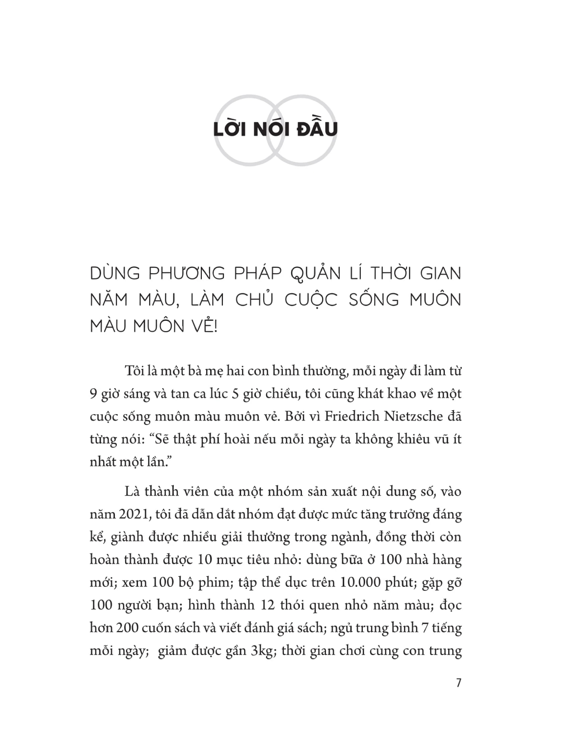 - Cấp độ thứ năm: Hình thành những thói quen nhỏ, khiến việc duy trì trở nên dễ dàng hơn. Cuốn sách này đưa ra 3 mẩu chuyện ngắn về phương pháp quản lí thời gian năm màu, 13 thực chiến quản lí thời gian năm màu, 14 cẩm nang phương pháp quản lí thời gian năm màu và 26 sơ đồ tư duy phương pháp quản lí thời gian năm màu. Trong phần Phụ lục có 11 lý thuyết quản lí thời gian thường thấy, 5 ứng dụng thường dùng để quản lí thời gian, danh mục sách tham khảo về quản lí thời gian và năm màu trong cuộc sống. Áp dụng phương pháp này vào thực tế, bạn sẽ sống một cuộc đời đầy màu sắc, cân bằng và tự do hơn!