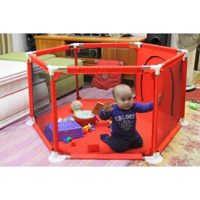 Quây bóng lục giác khung inox vải dù cho bé tặng kèm 5 quả bóng cho bé Cũi quây bóng khung inox chắc chắn an toàn cho bé là một sản phẩm vô cùng hữu ích cho các bé, vì vừa có thể là một đồ chơi nhà bóng lại có thể như một cũi vải giúp các bé nhỏ có thể tập đứng hoặc chơi an toàn mà không sợ nguy hiểm tác động bên ngoài. Cũi quây bóng khung inox chắc chắn an toàn cho bé có thiết kế 6 mặt với chất liệu vải dù lưới thông thoáng và các khung thép inox chắn chắn, được liên kết và bọc bởi cút nhựa dầy, hoặc chân đế nhựa cứng chịu lực cao, sản phẩm quây bóng cho bé có thể lắp đặt hết sức dễ dàng và tạo không gian chơi rộng rãi an toàn cho bé với diện tích lớn khoảng 1,5m2.