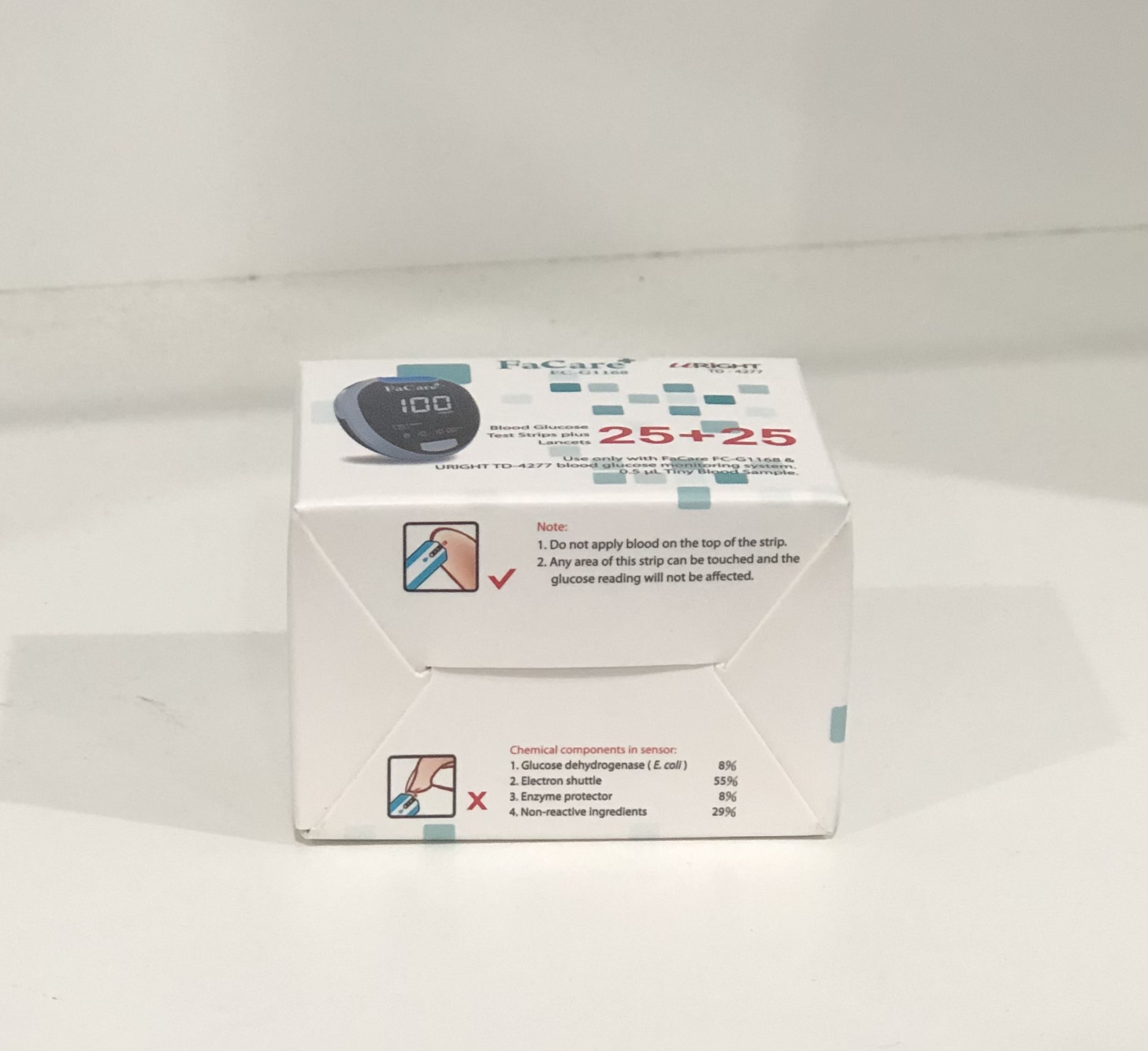 Que thử đường huyết dùng cho máy thử đường huyết Model Facare FC G1168 (TD 4277) Sử dụng công nghệ GDH-FAD, công nghệ tiên tiến nhất của CHLB Đức Đạt tiêu chuẩn chất lượng của Châu Âu Số lượng 25 que thử và tặng kèm 25 kim lấy máu Sản xuất tại Đài Loan Chỉ cần mẫu máu rất nhỏ