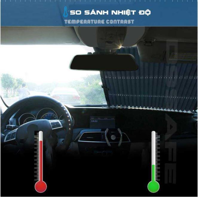 Rèm Che Nắng Ô tô, Rèm Che Nắng Kính Lái Ô tô MÔ TẢ SẢN PHẨM Rèm che nắng kính lái ô tô thiết kế dạng rèm kéo, cấu tạo gồm các lá nhôm phủ vào vải polyester cao cấp và dày. Rèm che nắng kính lái dùng được cả ở kính lái và kính hậu với hiệu quả chống nắng thì tuyệt vời, nhiệt độ giảm hơn 2/3 so với không dùng. Với cốc hút chân không cải tiến giúp hút chặt vào kính lái, một đầu cố định, một đầu di chuyển khiến việc đóng mở chỉ mất 2-3s, cực kỳ tiện lợi. ĐẶC TÍNH SẢN PHẨM: