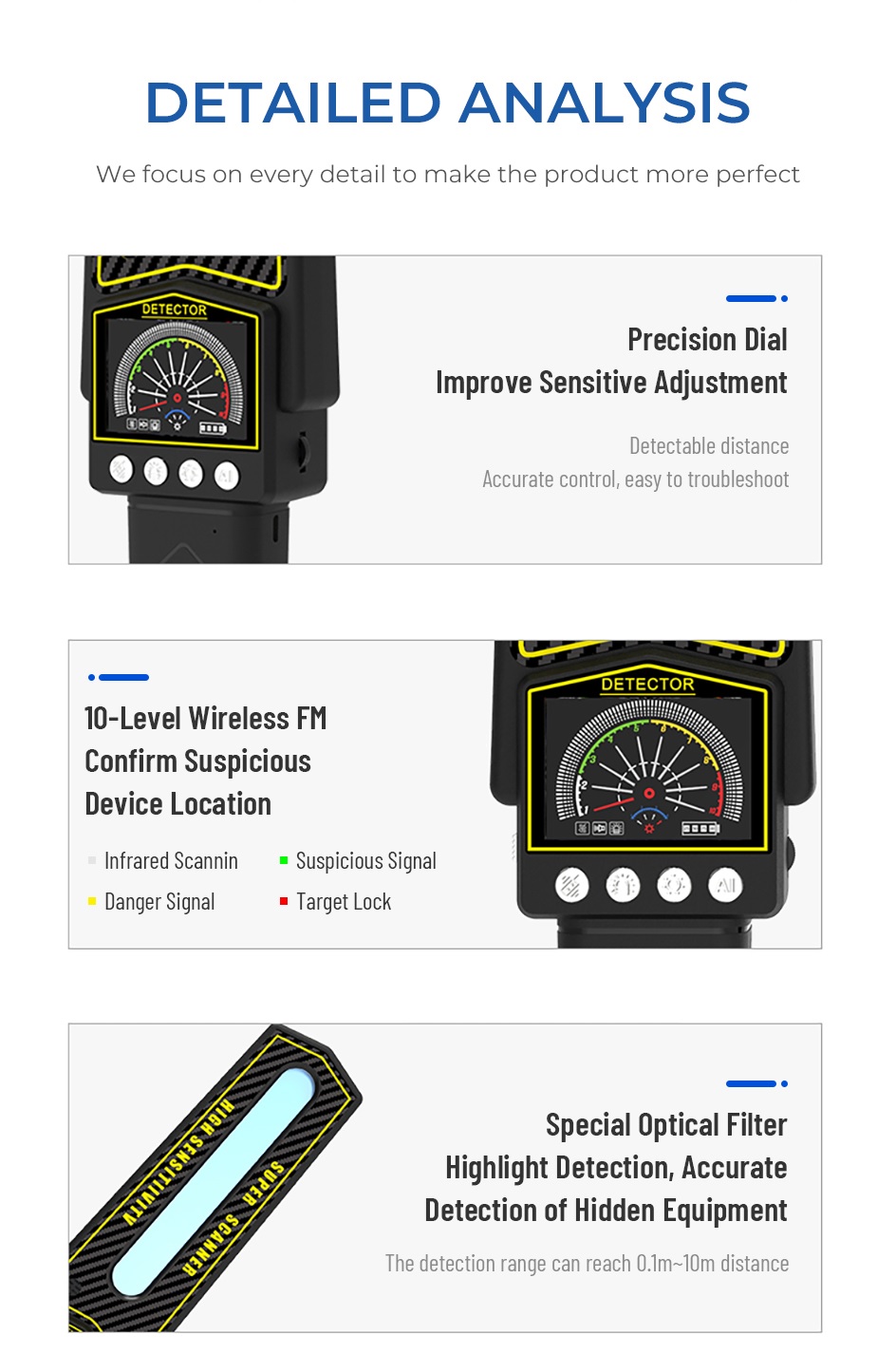 - Lật tẩy âm mưu đen tối: Phát hiện camera quay lén, máy ghi âm tinh vi, dù được giấu kín đến đâu, với khả năng quét dải tần rộng từ 1MHz đến 8000MHz.