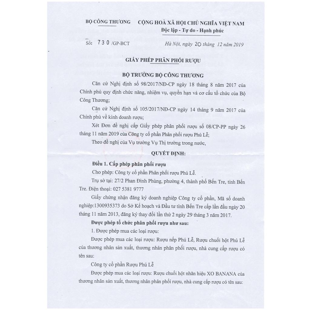 Sản phẩm của cơ sở sản xuất Rượu Danh Tửu Sản xuất và đóng chai tại nhà máy Rượu Phú Lễ --- Thành phần: Nếp mùa Ba Tri, cốt chuối hột rừng, men nấu