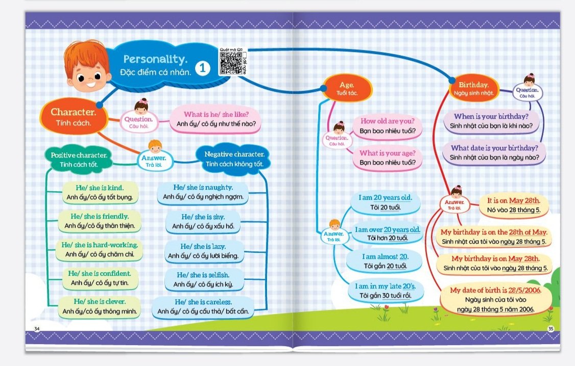 - KÈM THEO FILE ĐỌC TIẾNG ANH GIỌNG CHUẨN BẢN ĐỊA – QUÉT MÃ QR Để giúp cho trẻ có thể học nhanh, nhớ lâu, dễ dàng ôn tập, tự tin giao tiếp. Chúng tôi xin giới thiệu cuốn sách 1001 MẪU CÂU GIAO TIẾP TIẾNG ANH THÔNG DỤNG – THEO SƠ ĐỒ TƯ DUY MIND MAP, với hơn 30 chủ đề thường gặp trong cuộc sống hàng ngày và các mẫu câu giao tiếp thông dụng được trình bày theo dạng Sơ đồ tư duy Mind map rất logic, đơn giản và dễ hiểu. Kết hợp cùng với cuốn Chinh phục từ vựng tiếng Anh – Theo Sơ đồ tư duy Mind map, bộ 2 cuốn sách sẽ là cẩm nang giúp trẻ nắm vững hệ thống từ vựng tiếng Anh và giao tiếp tiếng Anh một cách tự tin, hiệu quả nhất. Đặc biệt, cuốn sách có kèm theo File đọc tiếng Anh giọng chuẩn bản địa, quét mã QR trên sách theo từng chủ đề, sẽ giúp trẻ luyện kĩ năng nghe – nói tốt hơn và phát âm chuẩn hơn. HƯỚNG DẪN BẢO QUẢN SÁCH THIẾU NHI: