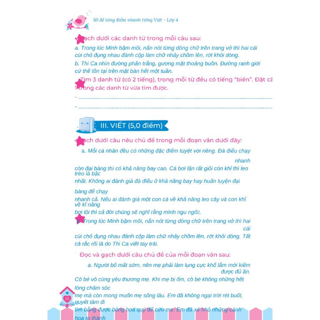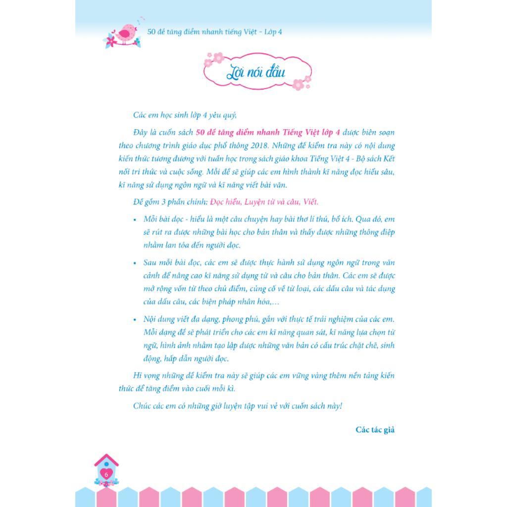 - Nội dung cuốn sách 50 Đề Tăng Nhanh Điểm Tiếng Việt Lớp 4 Mỗi đề thi gồm 3 phần chính: Đọc hiểu, Luyện từ và câu, Viết.